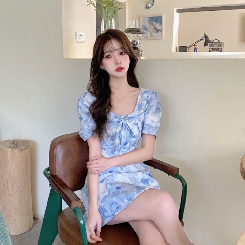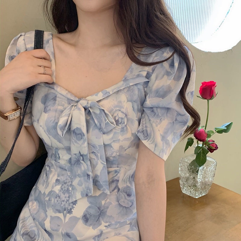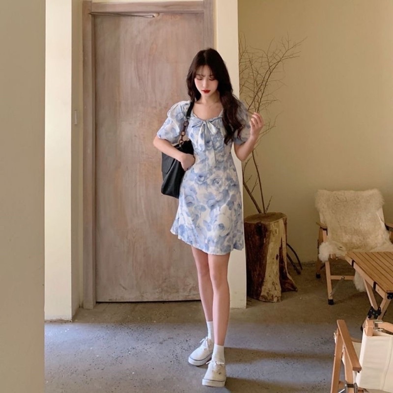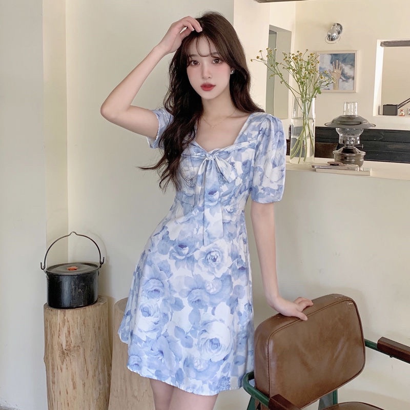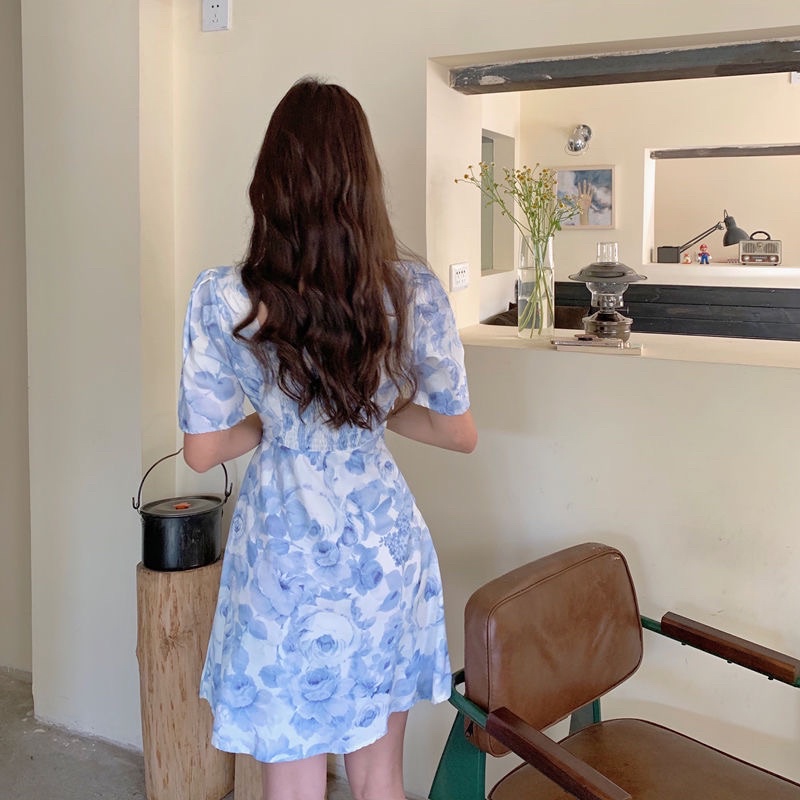 D130- Daisy Floral Midi Dress Square neck/ Korean Vintage Midi Dress casual summer dress