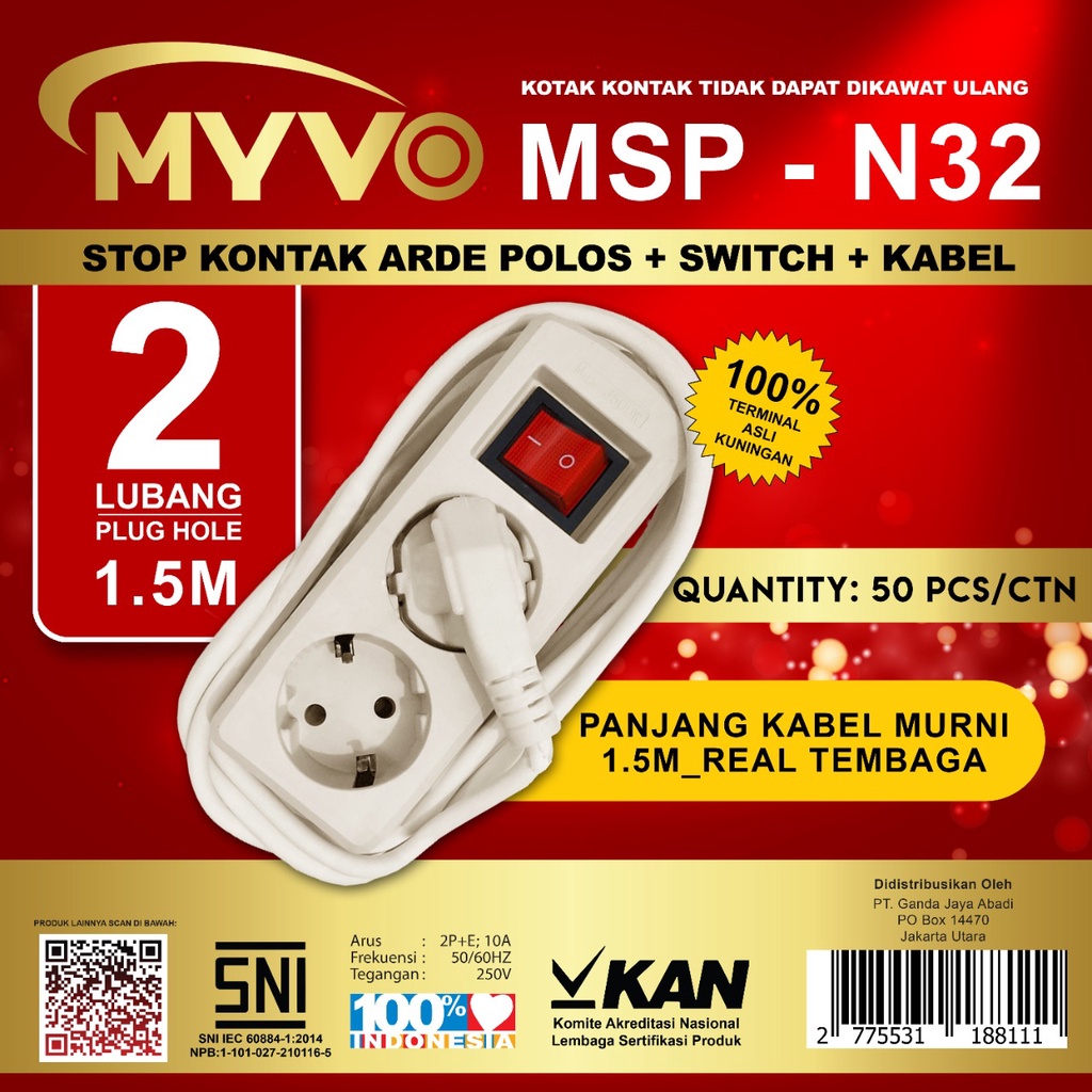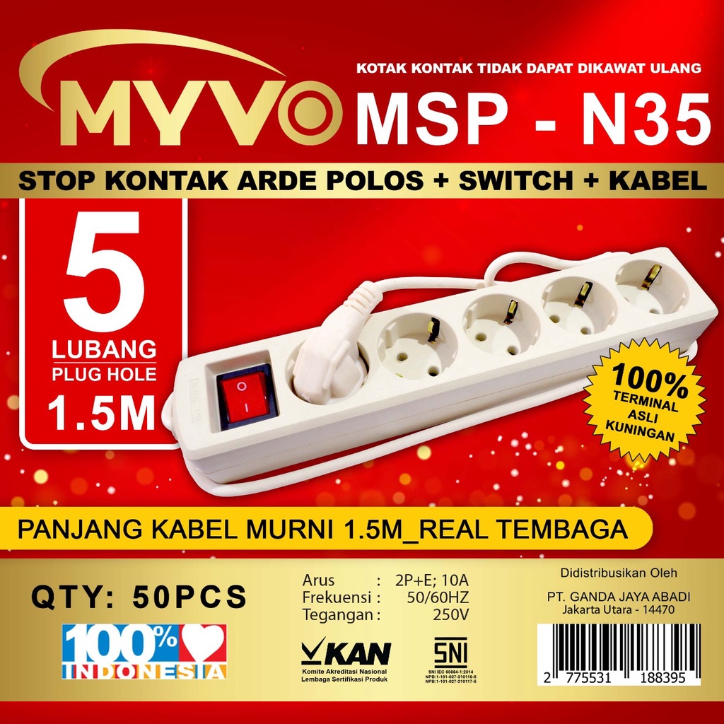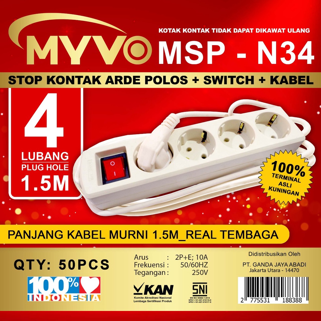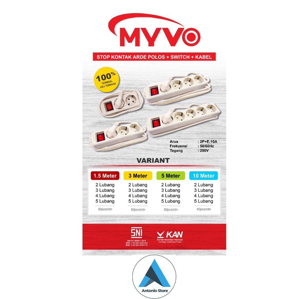 MYVO STOP KONTAK 1,5 meter 2 lubang, 3 lubang, 4 lubang, 5 lubang