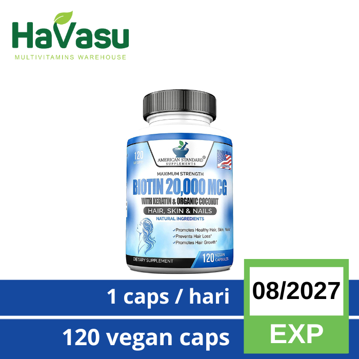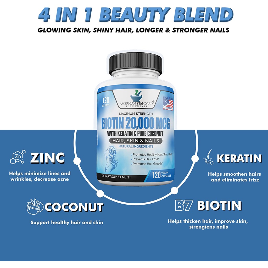 Biotin 20,000 mcg with Keratin Organic Coconut and Zinc American Standard Supplements Hair Skin Nails
