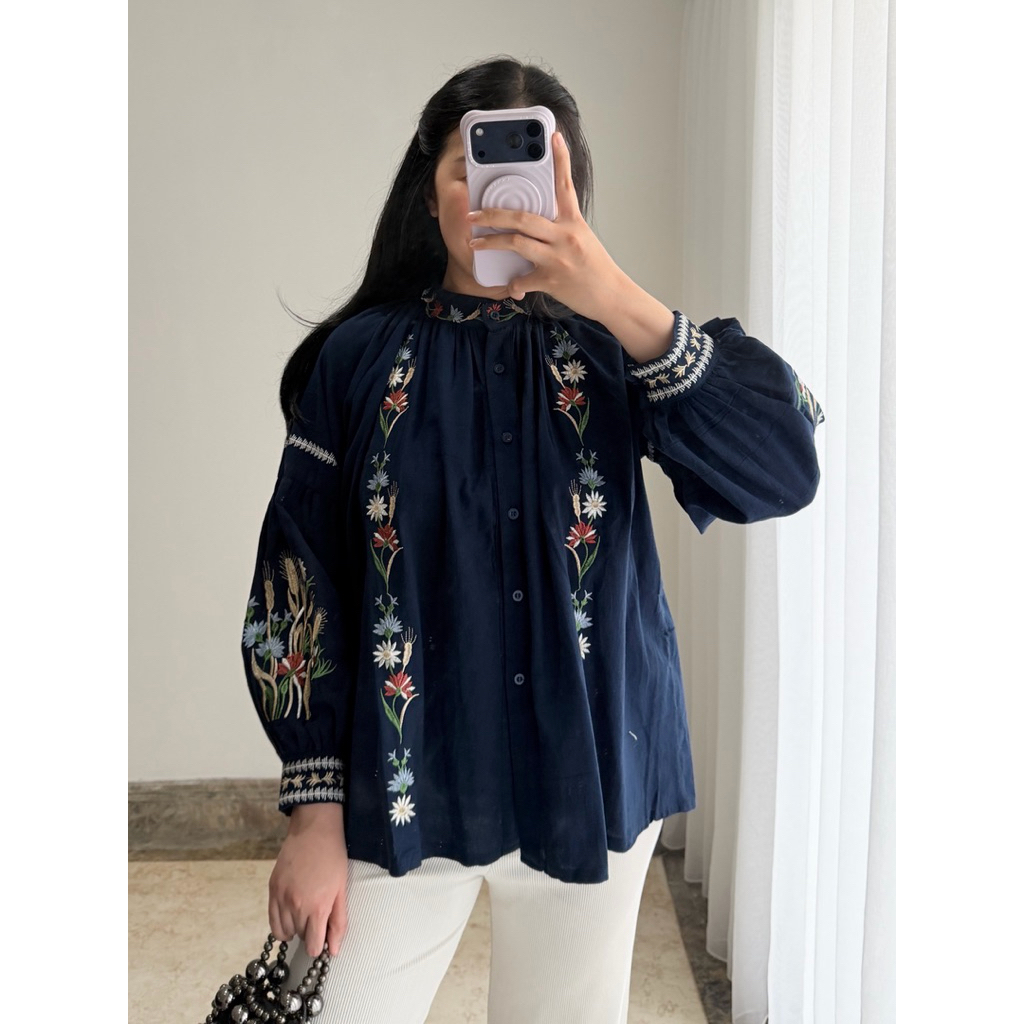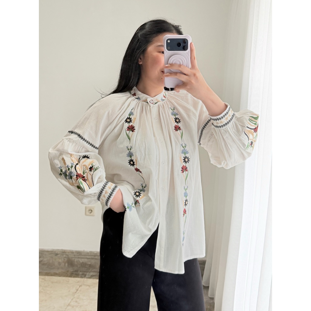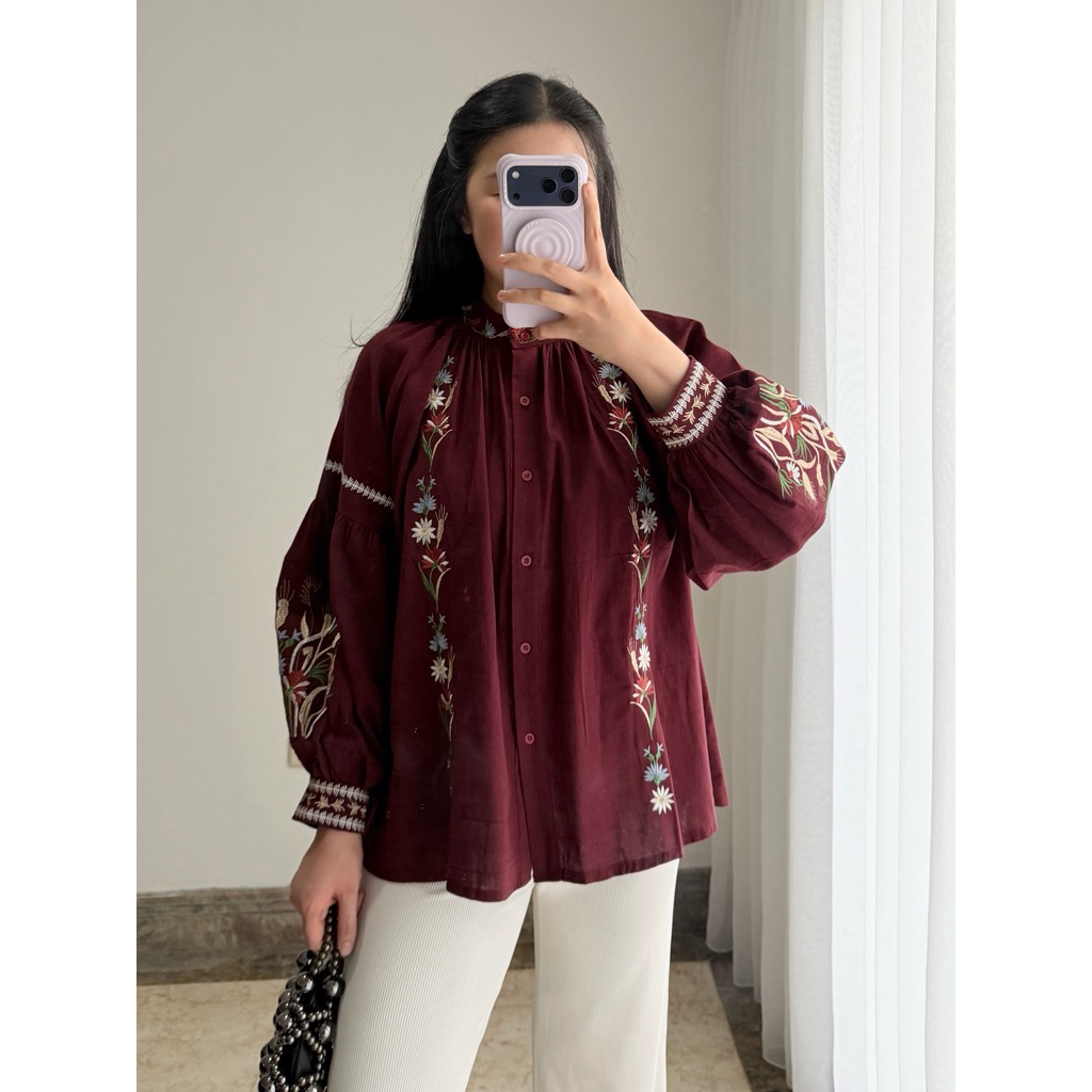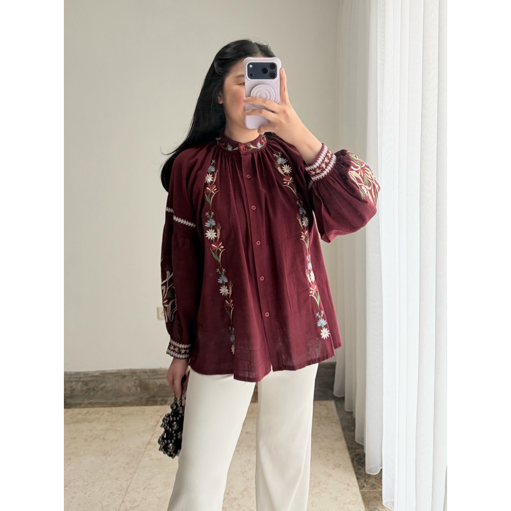 Eska Clothing - Thalia Blouse Shirt Atasan Wanita Linen Bordir Bunga Lengan Balon
