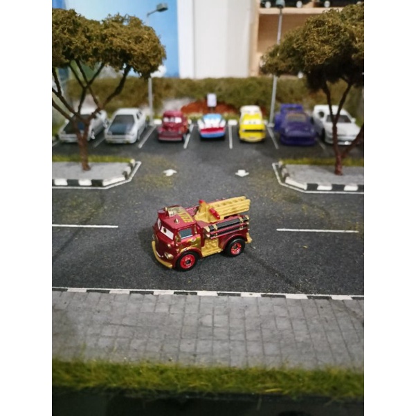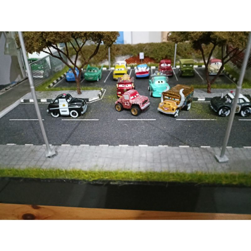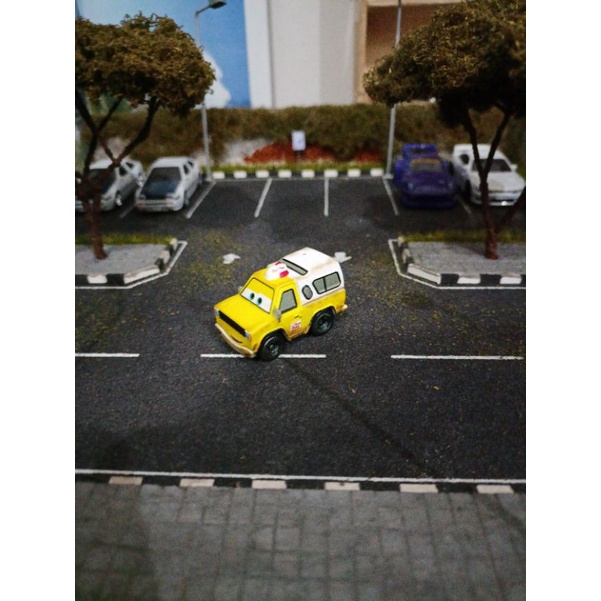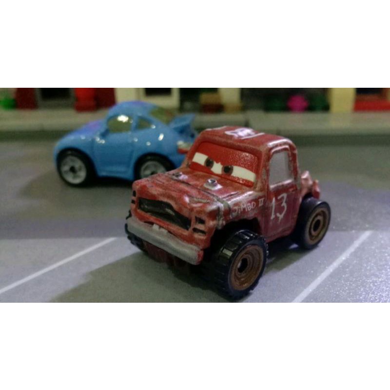 Disney mini cars blue mater, flo, francesco bernoulli, cigalert, rusteze red metalic,sally, tod pizza,smokey hot rod, .miss fritter gold, jimbo jeep