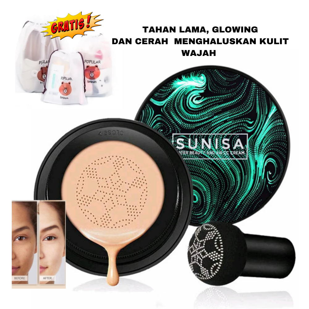 Sunisa Bedak tahan air dan keringat Glowing cushion tahan Lama original , BB dan cc cream Asli korea Waterproof mushroom, foundation, alas bedak, primer, make Up Viral tiktok Gratis pouch kosmetik, sheet mask