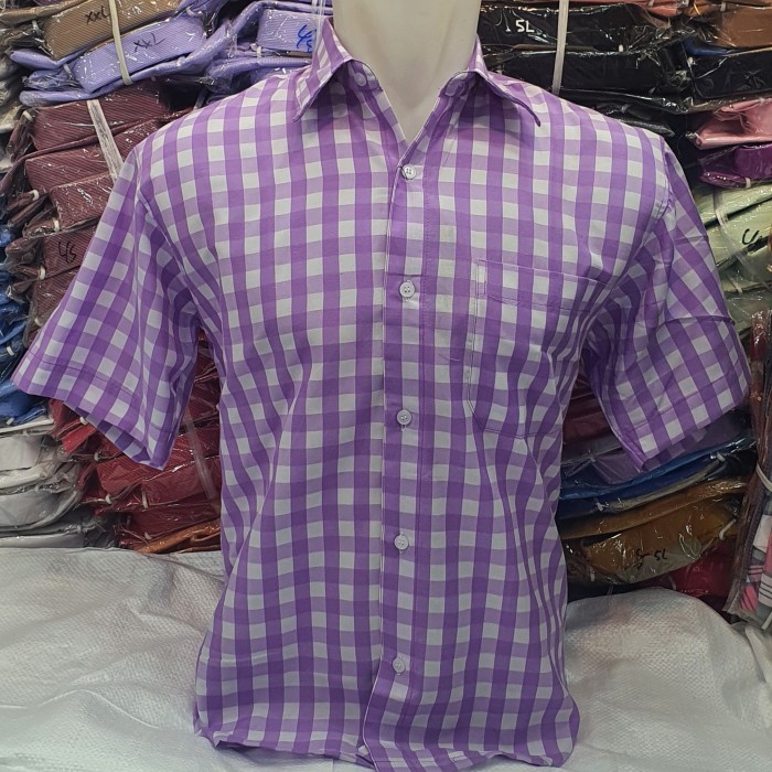 Kemeja Motif Kotak Ungu Lilac Lengan Pendek Seragam Big Size Jumbo 7L
