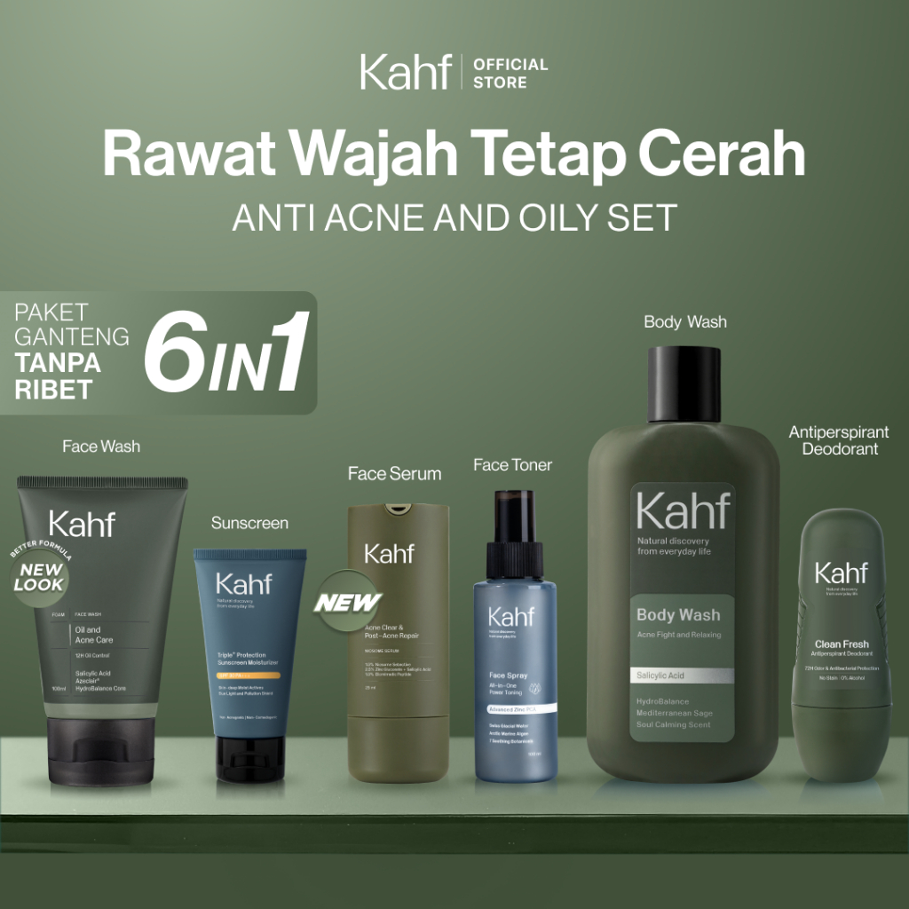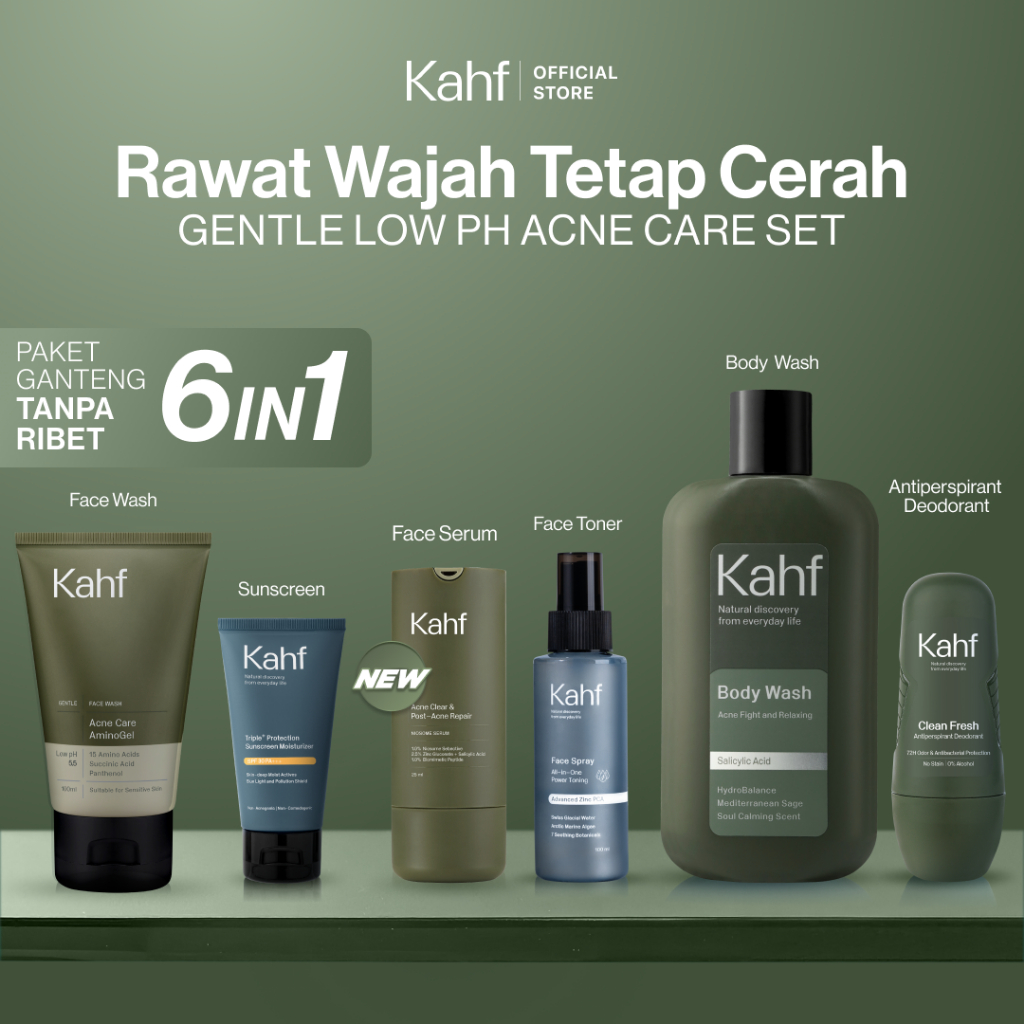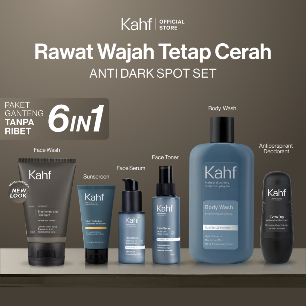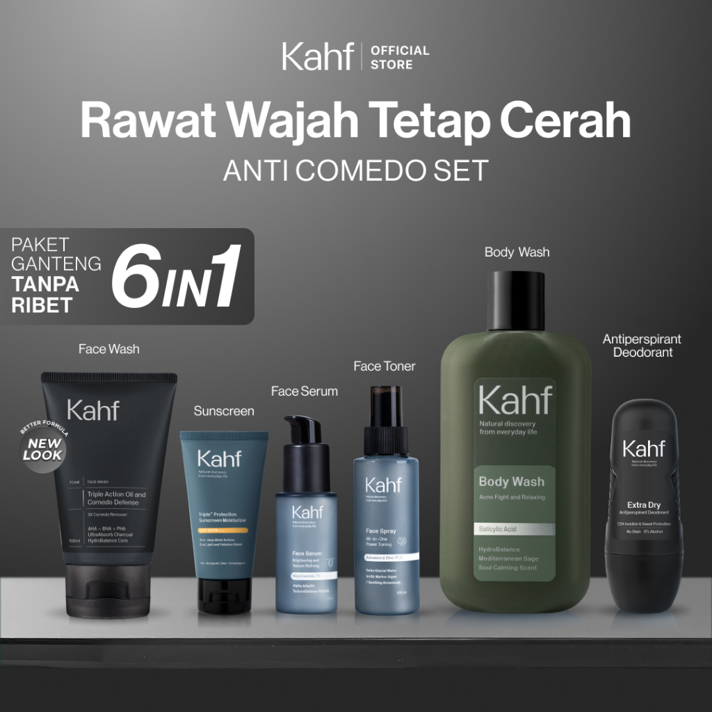 [KAHF BUNDLE 6IN1 PAKET GANTENG TANPA RIBET] Paket Complete Set (Face Wash + Toner + Serum + Sunscreen Moisturizer + Body Wash + Deodorant) - Rawat Wajah Tetap Cerah & Tanpa Jerawat - Suitable for Daily Use & Sensitive Skin