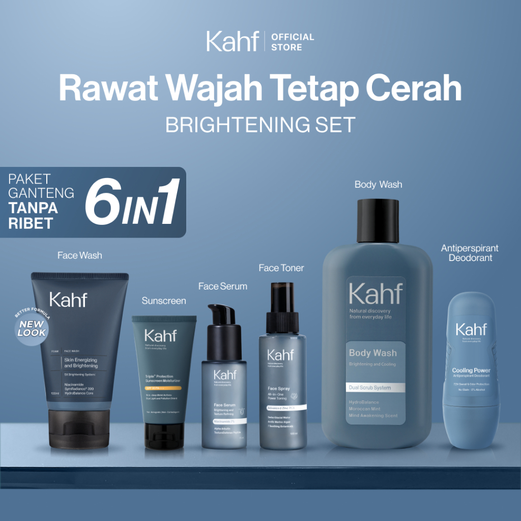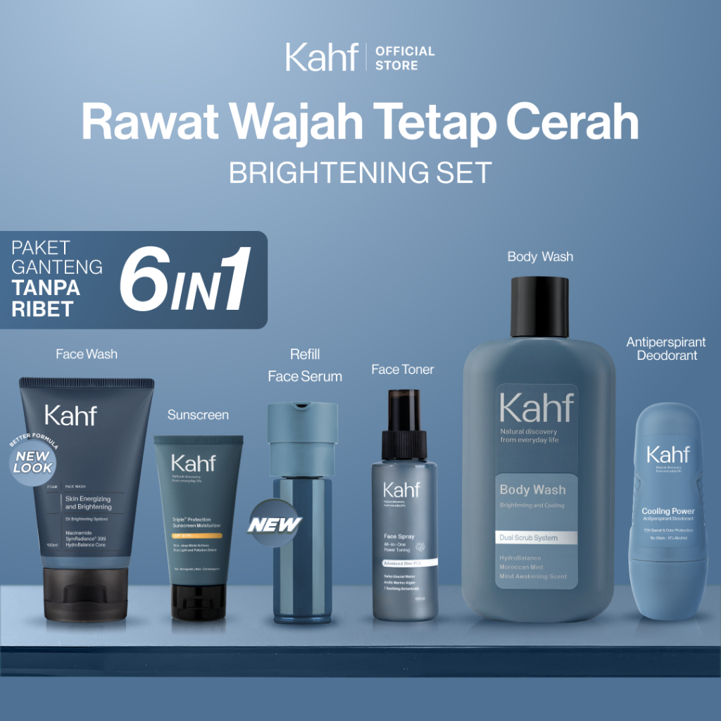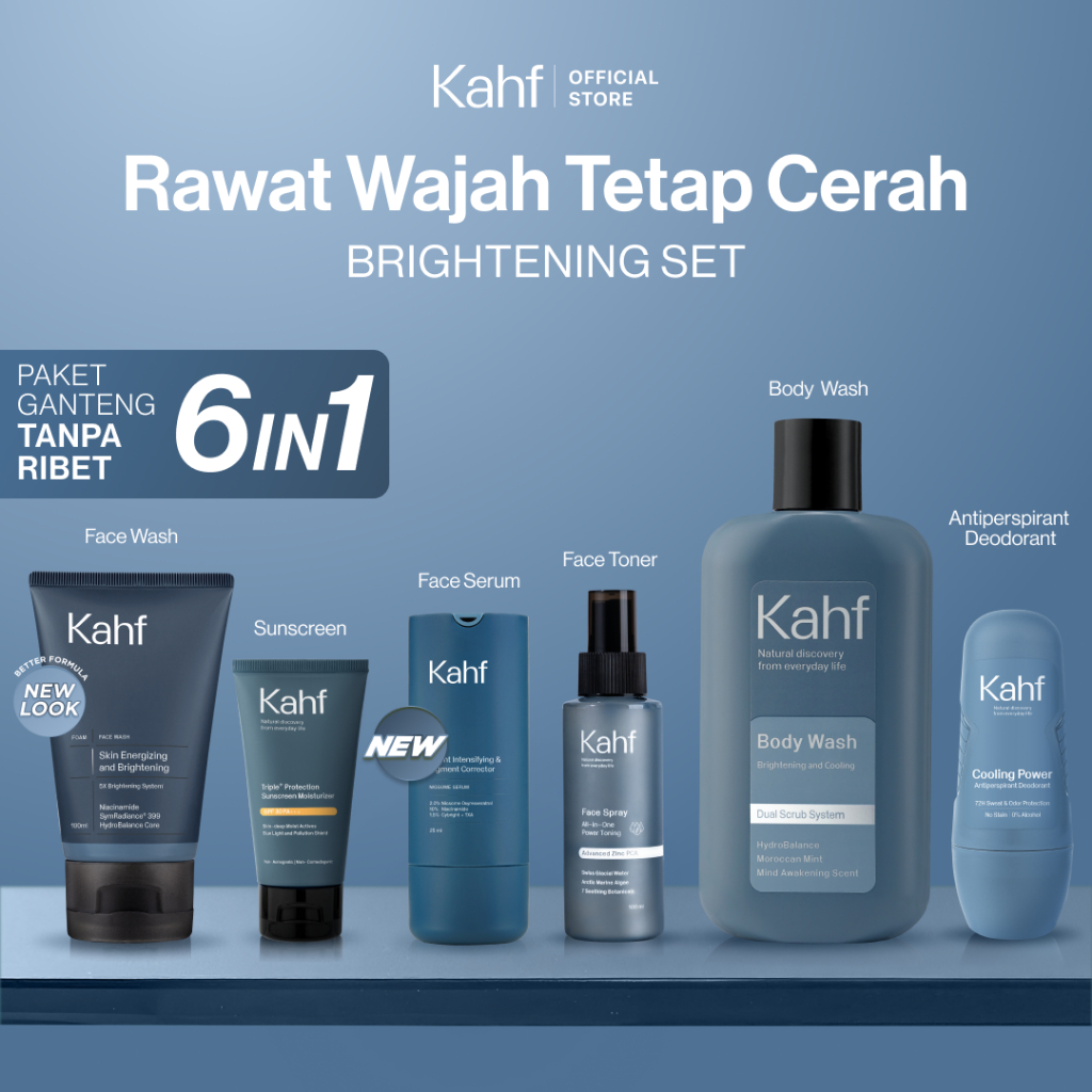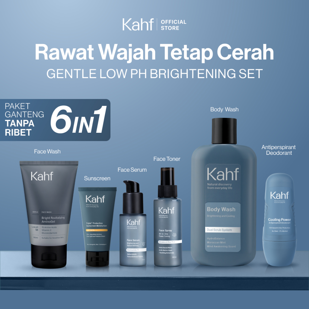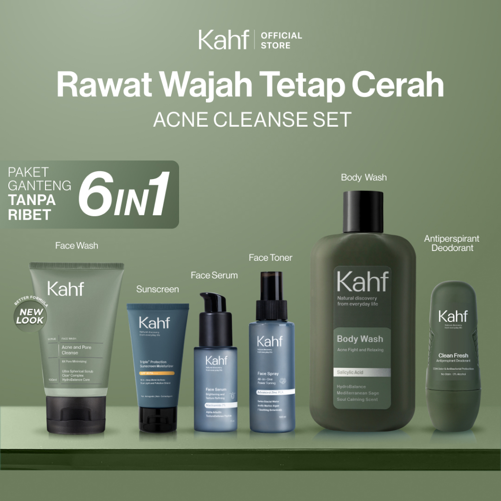 [KAHF BUNDLE 6IN1 PAKET GANTENG TANPA RIBET] Paket Complete Set (Face Wash + Toner + Serum + Sunscreen Moisturizer + Body Wash + Deodorant) - Rawat Wajah Tetap Cerah & Tanpa Jerawat - Suitable for Daily Use & Sensitive Skin