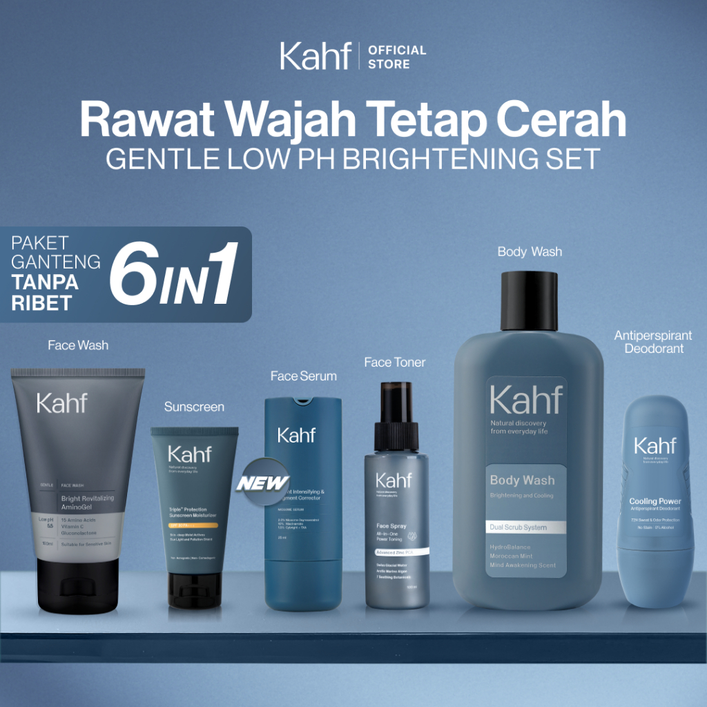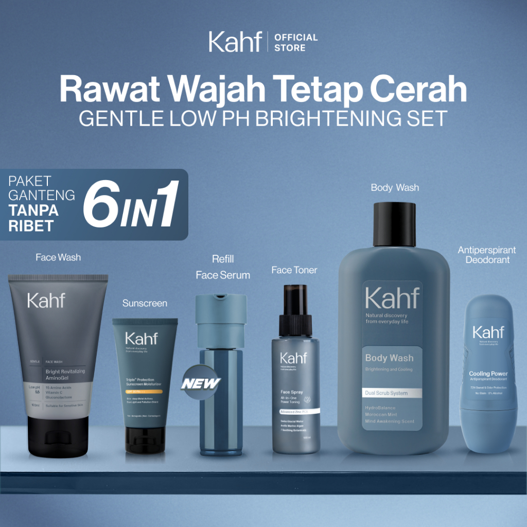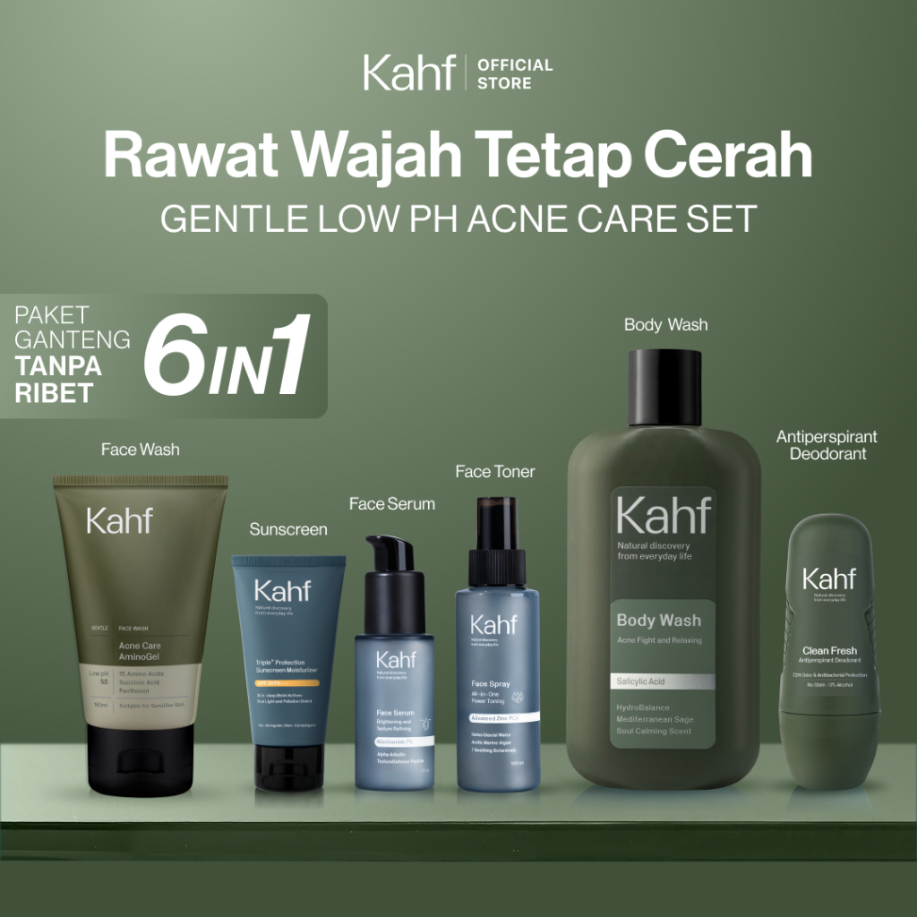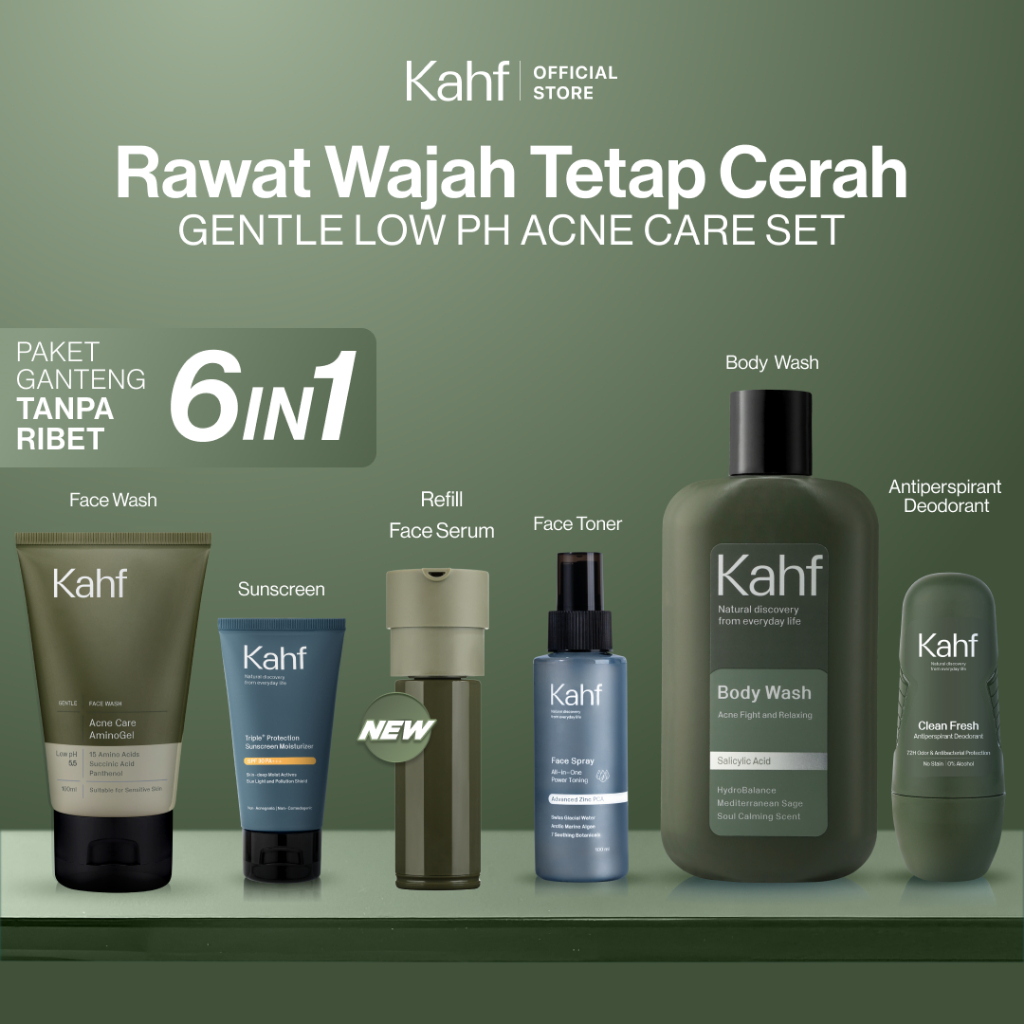 [KAHF BUNDLE 6IN1 PAKET GANTENG TANPA RIBET] Paket Complete Set (Face Wash + Toner + Serum + Sunscreen Moisturizer + Body Wash + Deodorant) - Rawat Wajah Tetap Cerah & Tanpa Jerawat - Suitable for Daily Use & Sensitive Skin