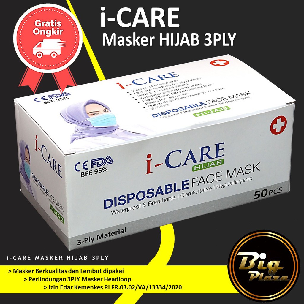 HIJAB Putih I-Care Masker Hijab Putih 3ply Headloop isi 50 Pcs Icare Full White - Big Plaza