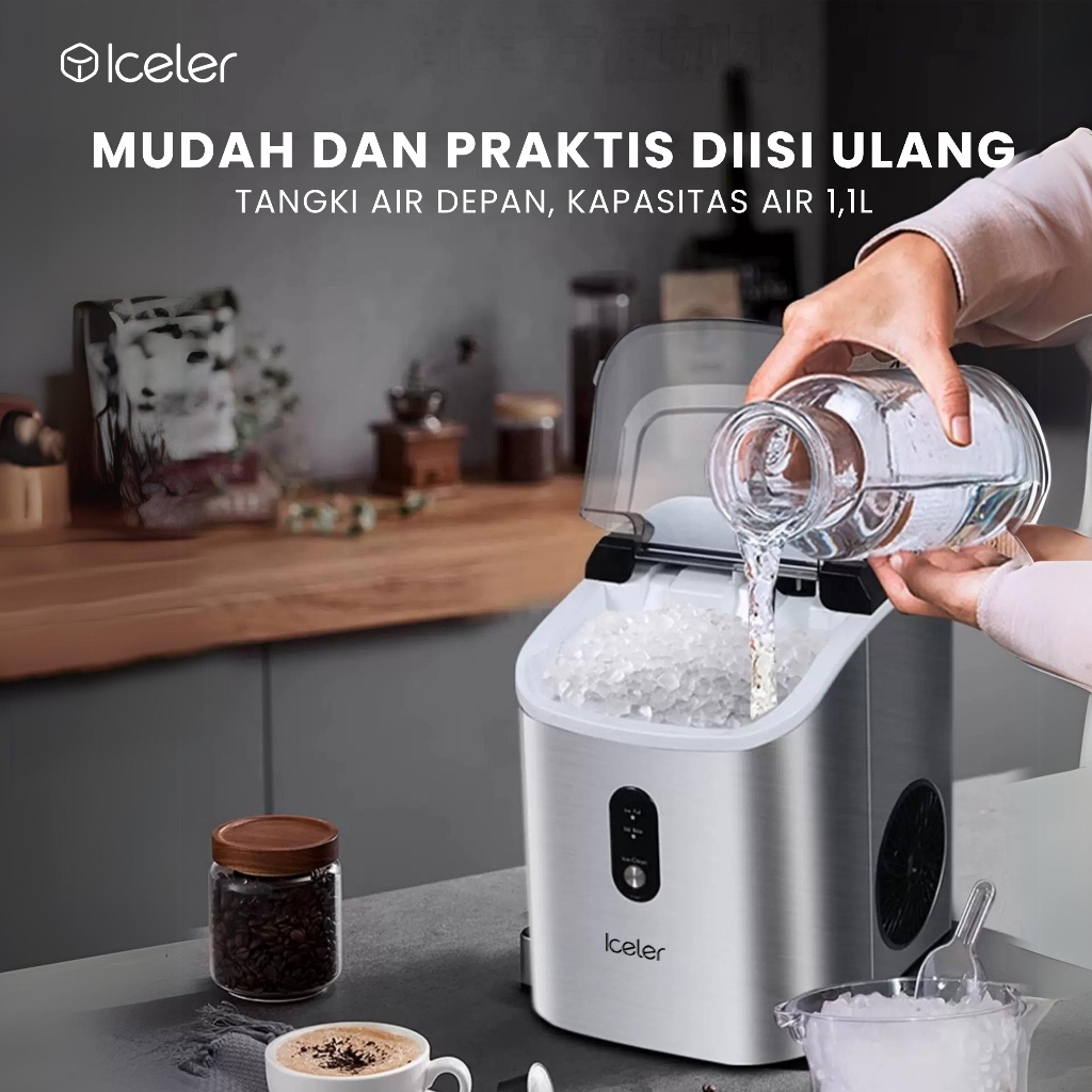 Iceler Mesin Es Nugget Es Kecil Cocok Digigit Hasil Nugget Ice Terus Menerus 15Kg/24Jam Otomatis Home Use Ice Maker