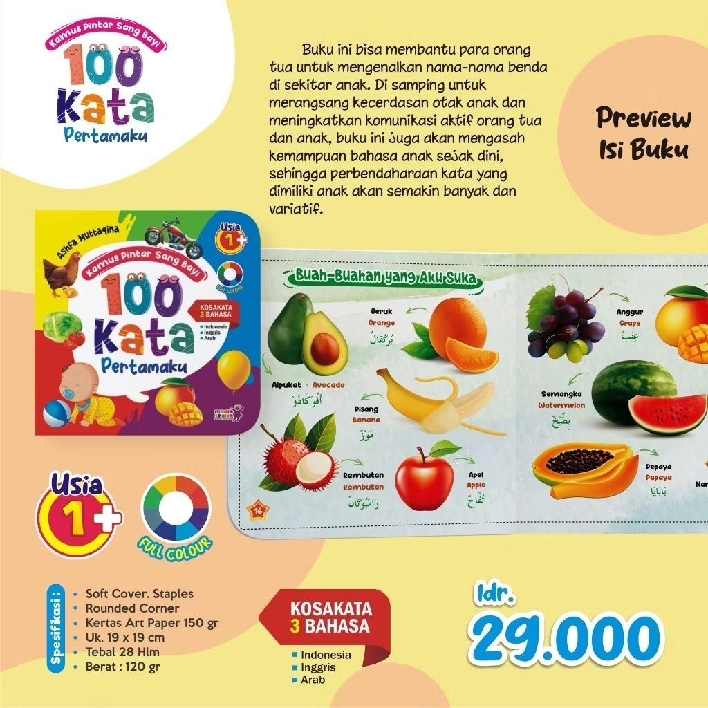 Buku 100 Kata Pertamaku "Kamus Pintar Sang Bayi" (Full Colour) Balita Usia 1+ Tahun