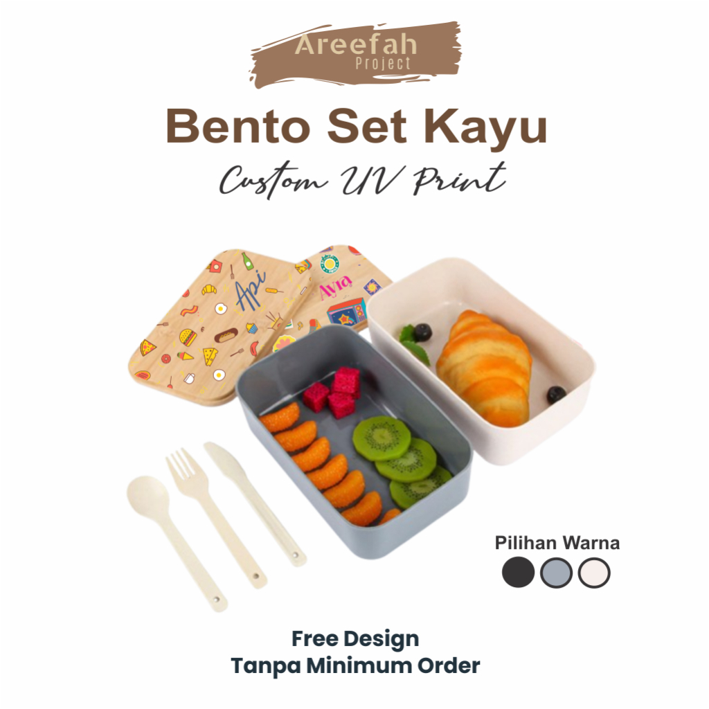 AREEFAH/TEMPAT MAKAN BENTO SET KAYU CUSTOM 900ML UV PRINT ADA 3 PILIHAN WARNA TANPA MINIMUM ORDER