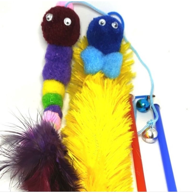 Tongkat Bulu Plus Lonceng PomPom Cat Teaser Mainan Kucing Anjing - Tali Pendek