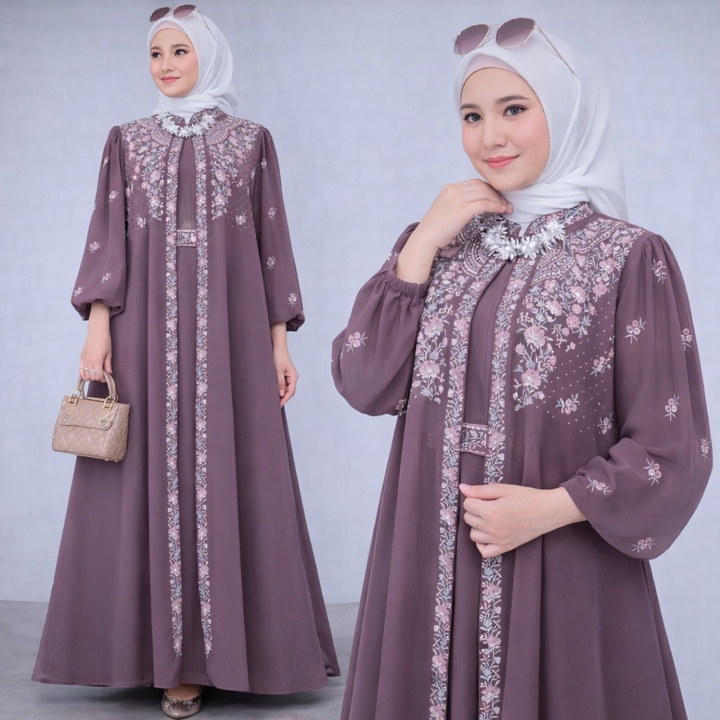 Vallina Outfit Rabbania Maxy Dress Bordir Cape Layer Cerutty Gamis Pesta Kondangan Premium Lebaran