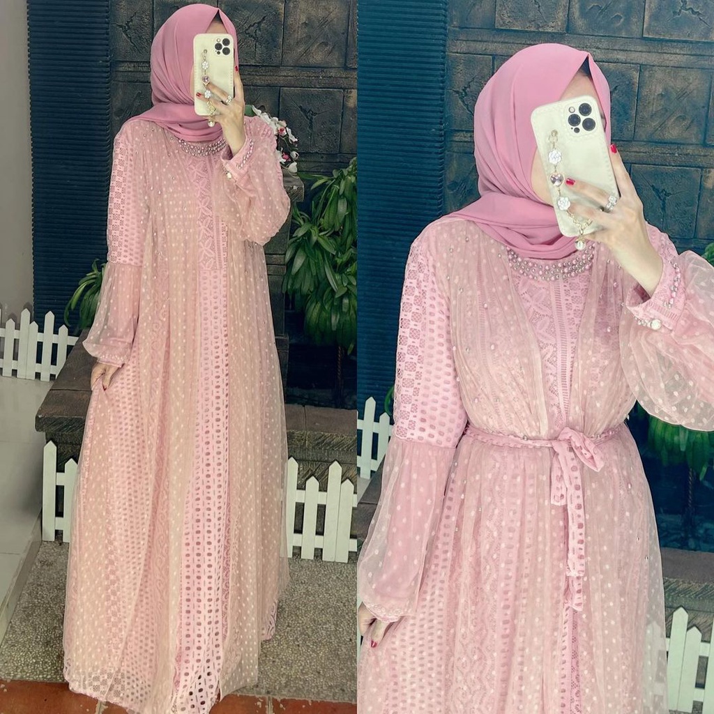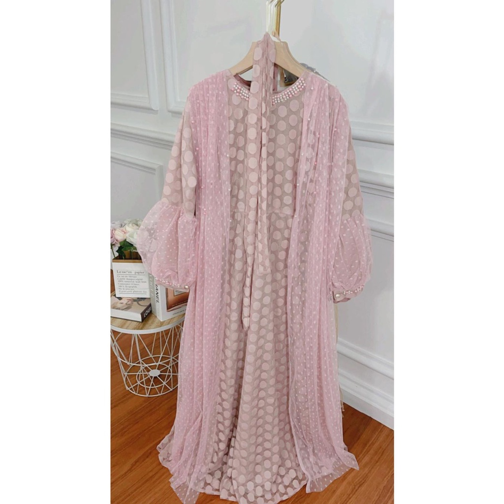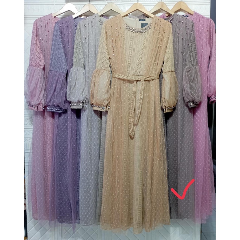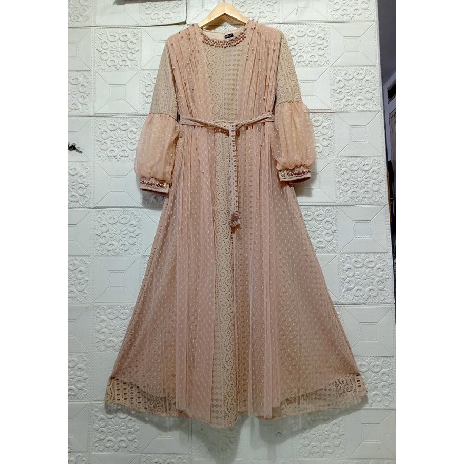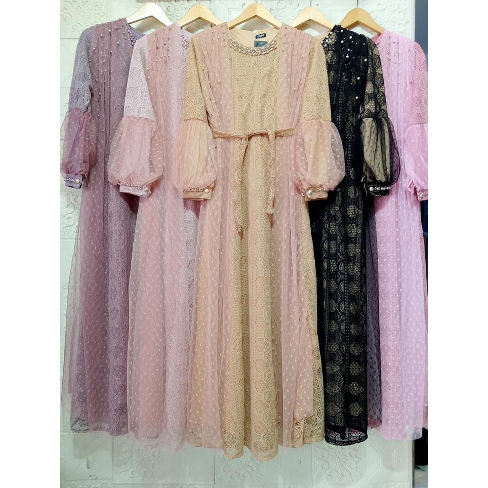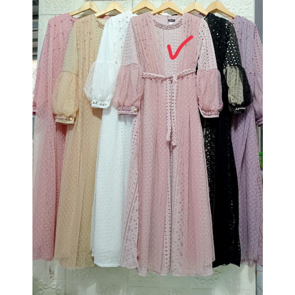 Gamis Brokat Tangan Balon Mutiara Leher New Collection