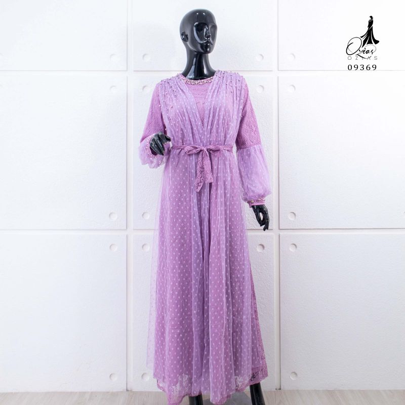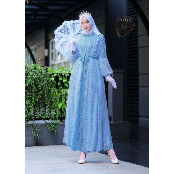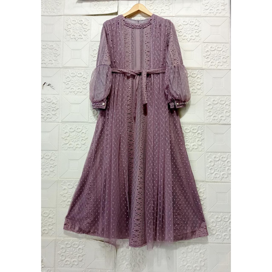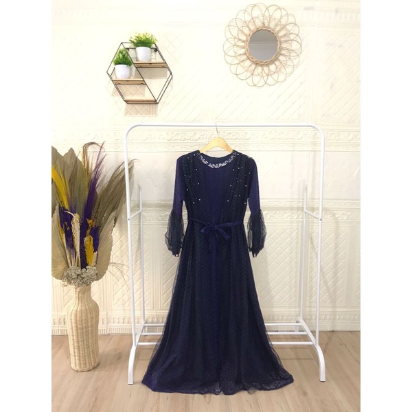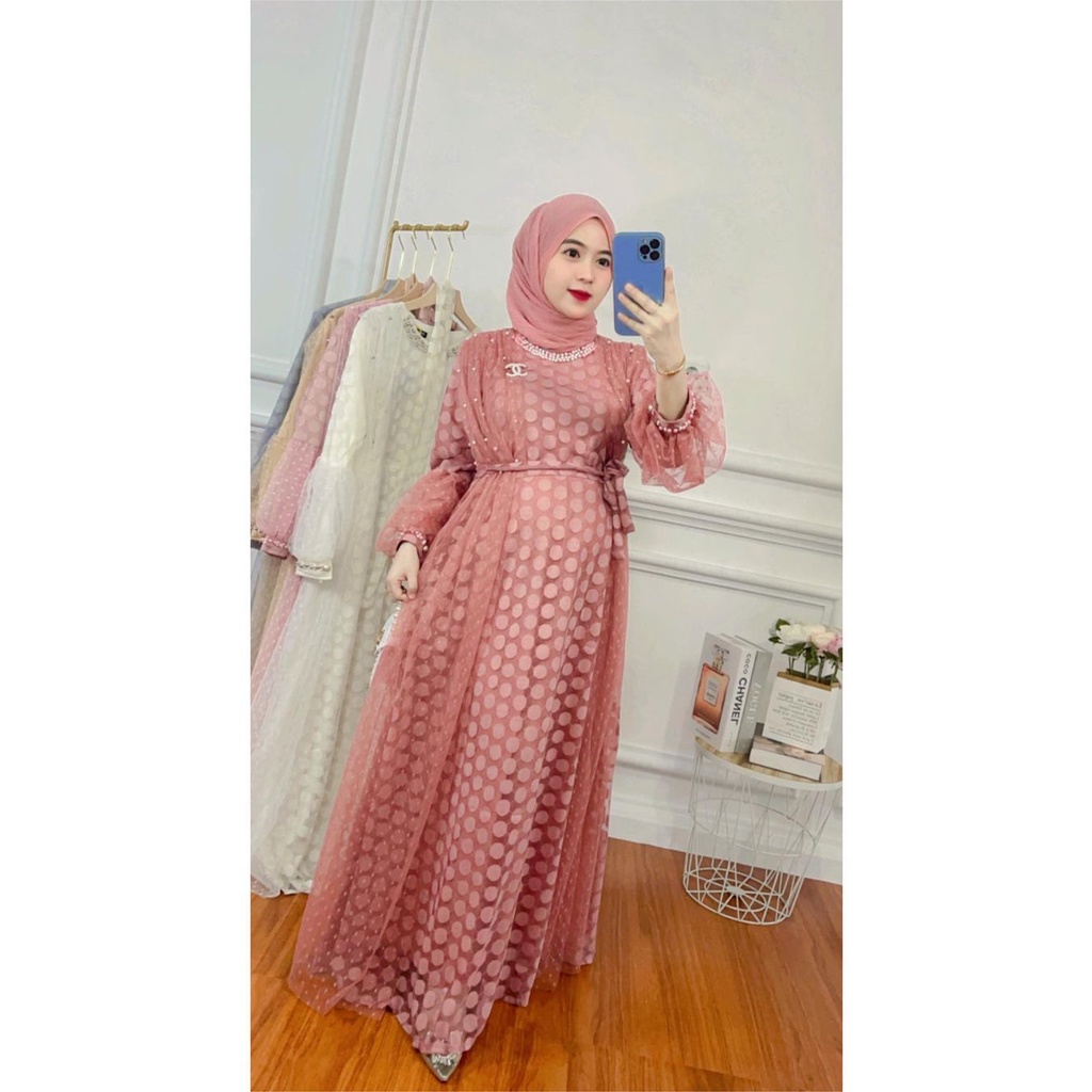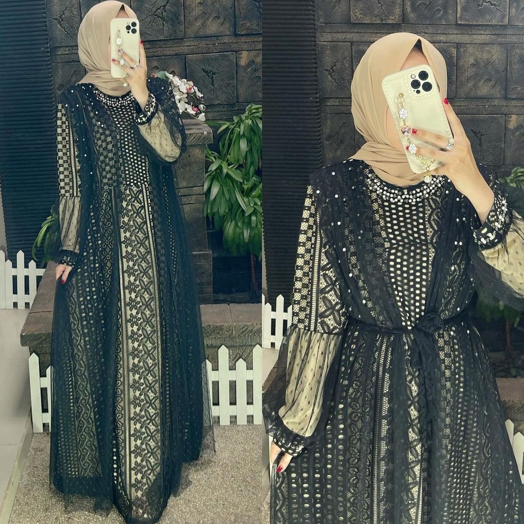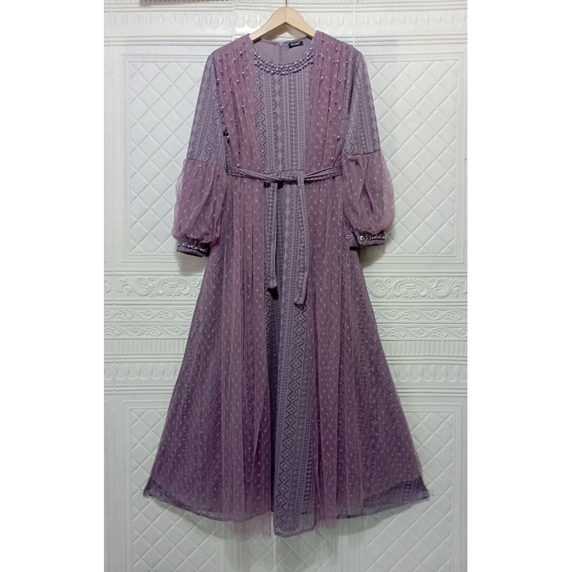 Gamis Brokat Tangan Balon Mutiara Leher New Collection