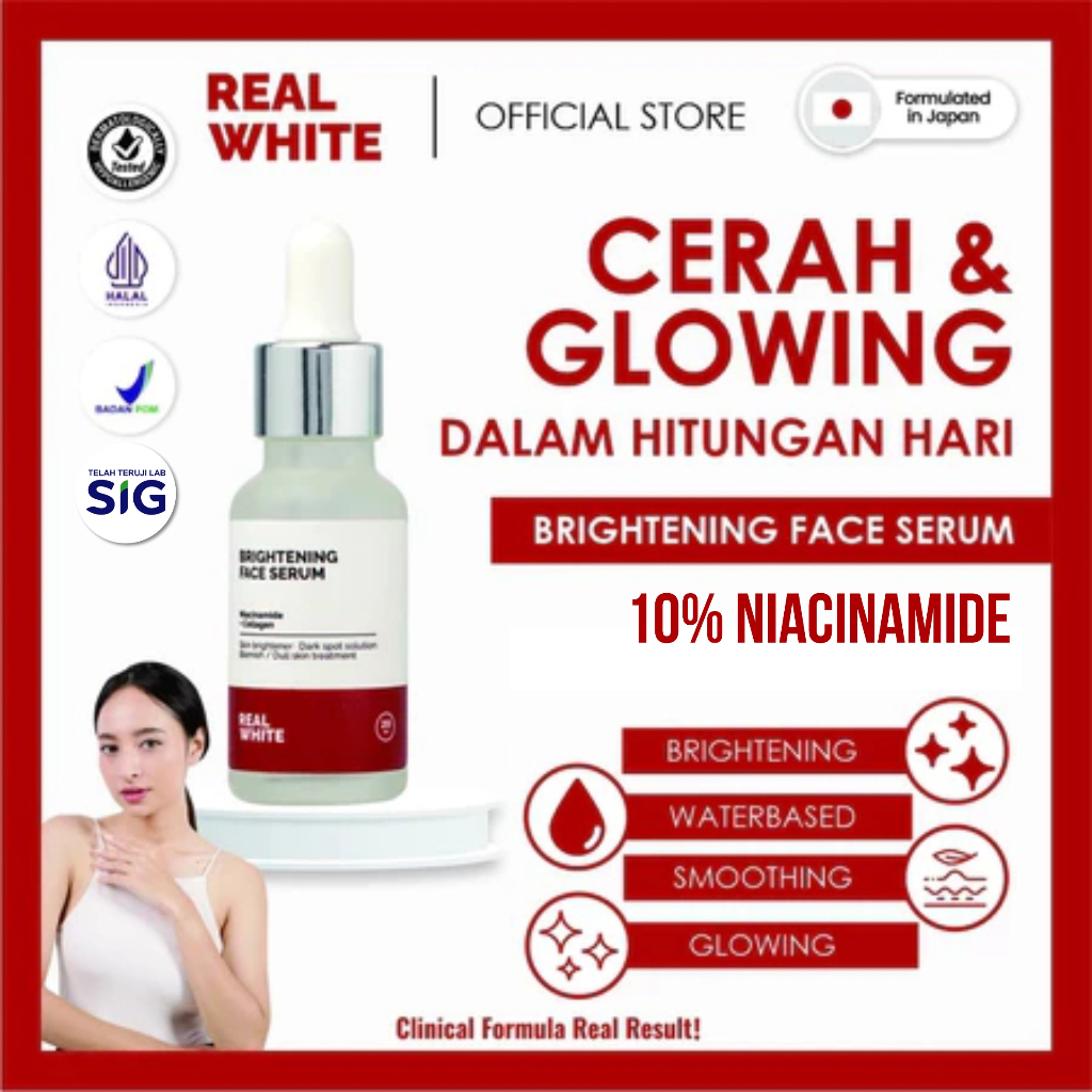 [10% NIACINAMIDE] REAL WHITE 10% Niacinamide + Collagen Brightening Face Serum | BPOM HALAL Skincare Whitening Pemutih Pencerah Memutihkan Mencerahkan Kulit Wajah PIE PIH Barrier Menghilangkan Flek Noda Jerawat Apotek Farmasi Dokter Glowing