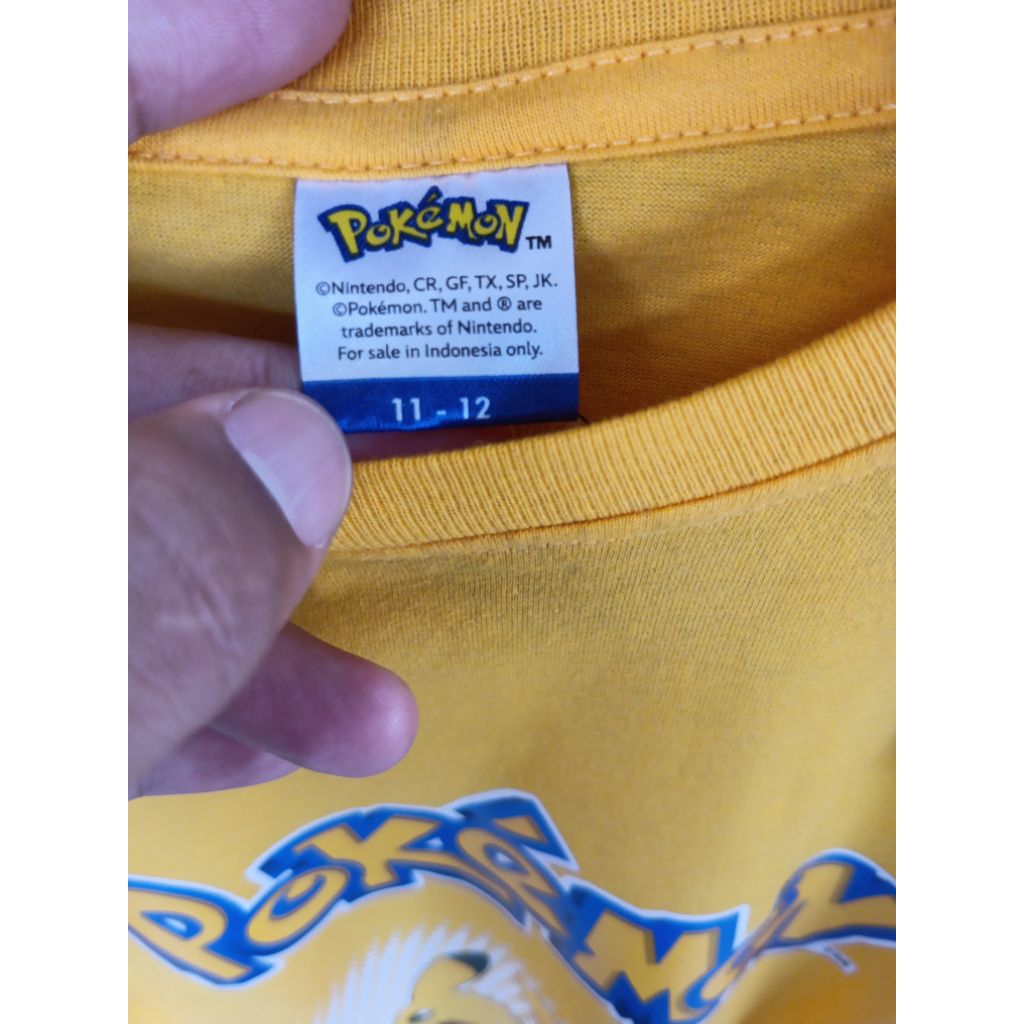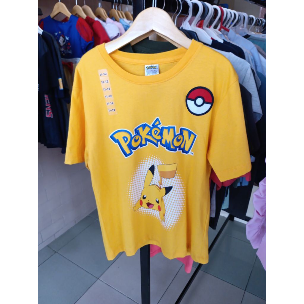 Pokemon Kaos Kuning dengan Gambar Pikachu Bordir Logo Bola Size 11-12 untuk Penggemar