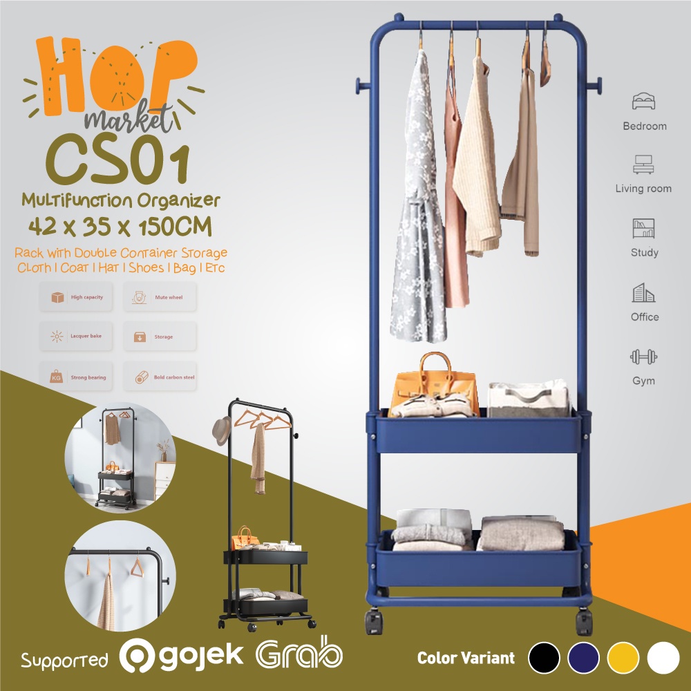 HOP CS01 Rak Serbaguna Portable 2 Layer dengan Roda Stand Hanger untuk Pakaian Baju / Topi / Sepatu & Lemari Gantungan Tas