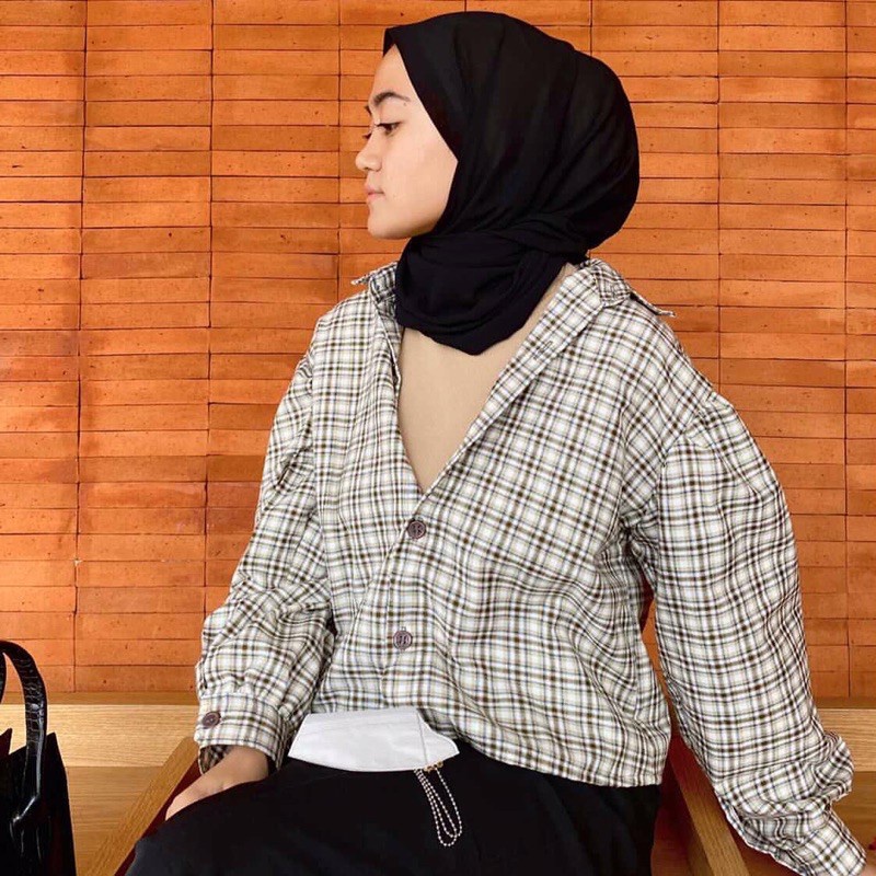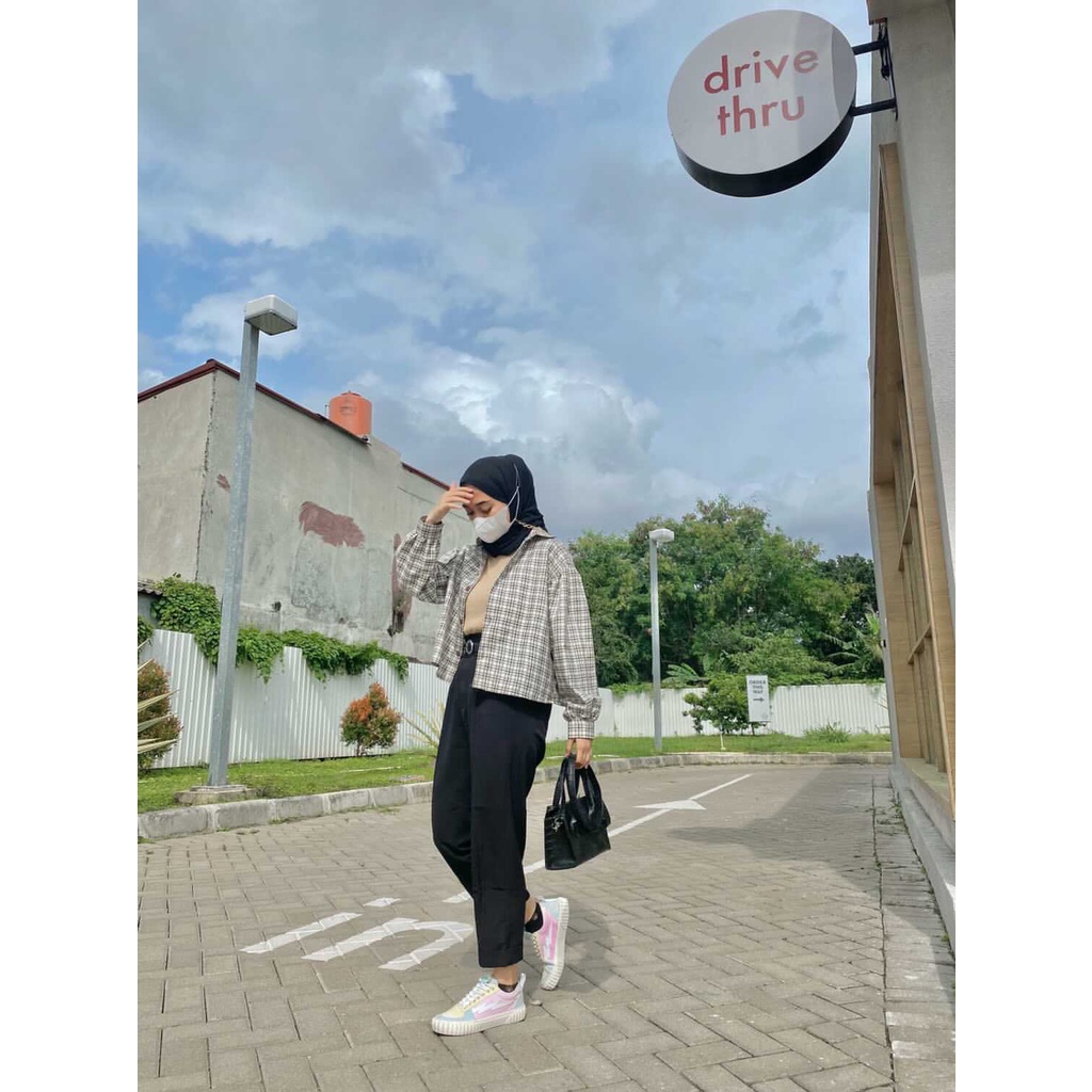 KEMEJA TARTAN KOTAK KOTAK CROP OVERSIZE KOREAN WANITA STYLE