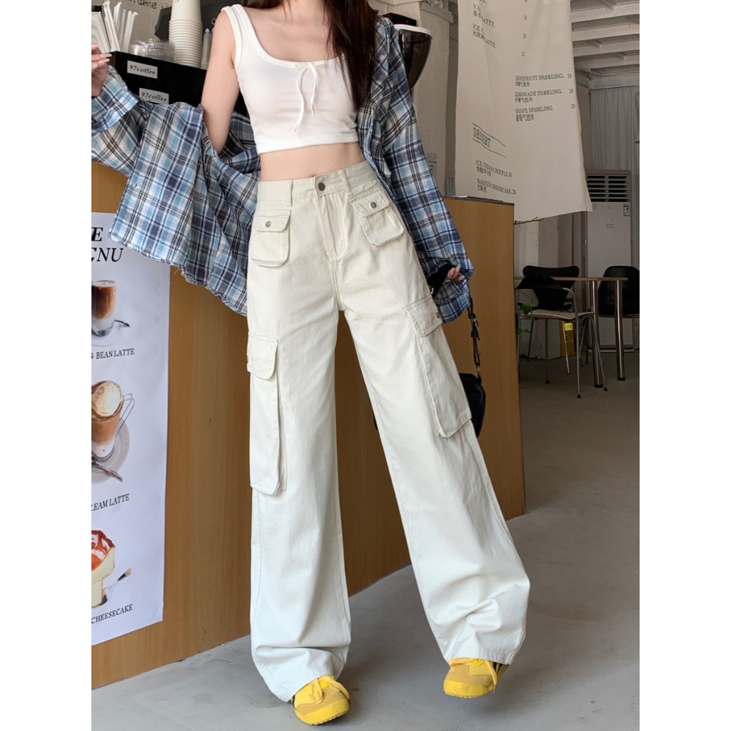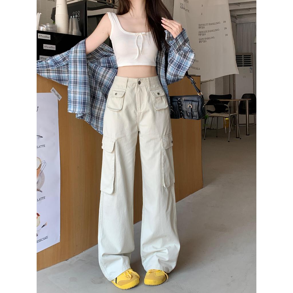 American Retro Putih Celana Kargo Wanita Highwaist Straight Wide Leg Celana Cargo Premium Wanita Import Causual Baggy Celana Wanita Terbaru