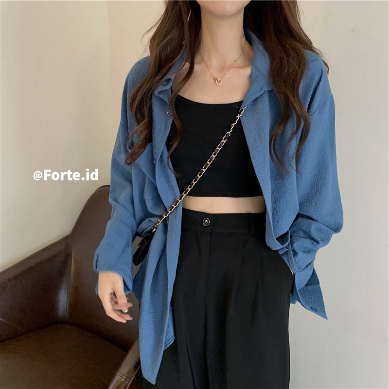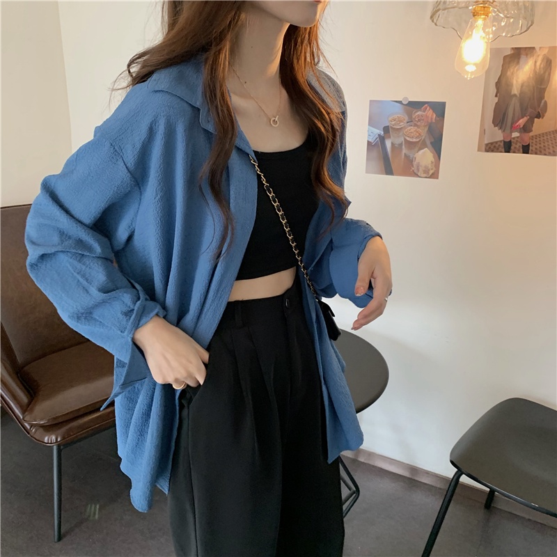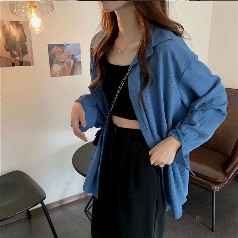 Kemeja lengan panjang kasual oversize warna solid wanita Korea style atasan
