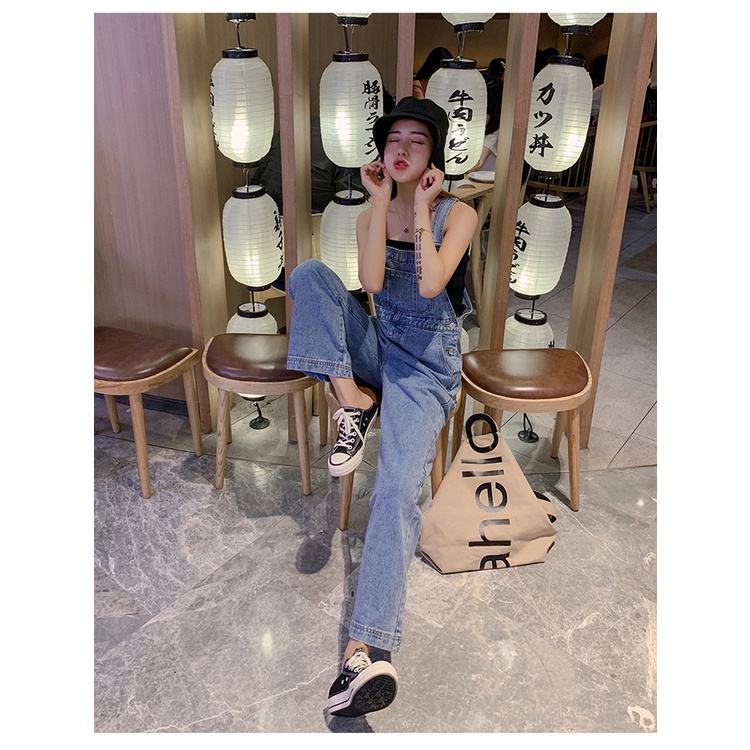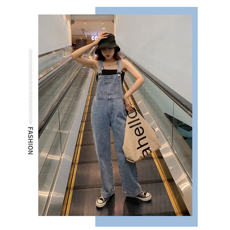 Jumpsuit Celana Lebar Kaki Overall denim panjang Tali Ikat Celana Wanita Tinggi Pinggang Longgar dan Melangsingkan Denim Suspender Celana Wanita
