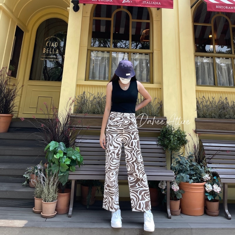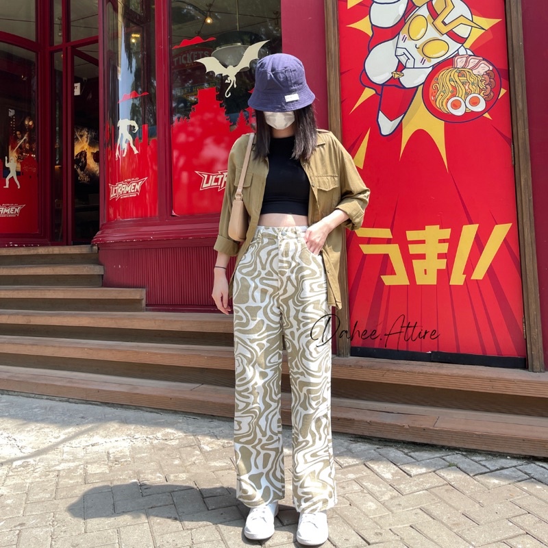 Marble Printed Pants Celana Panjang Wanita Motif Marble Highwaist Pants - Mabel Jeans