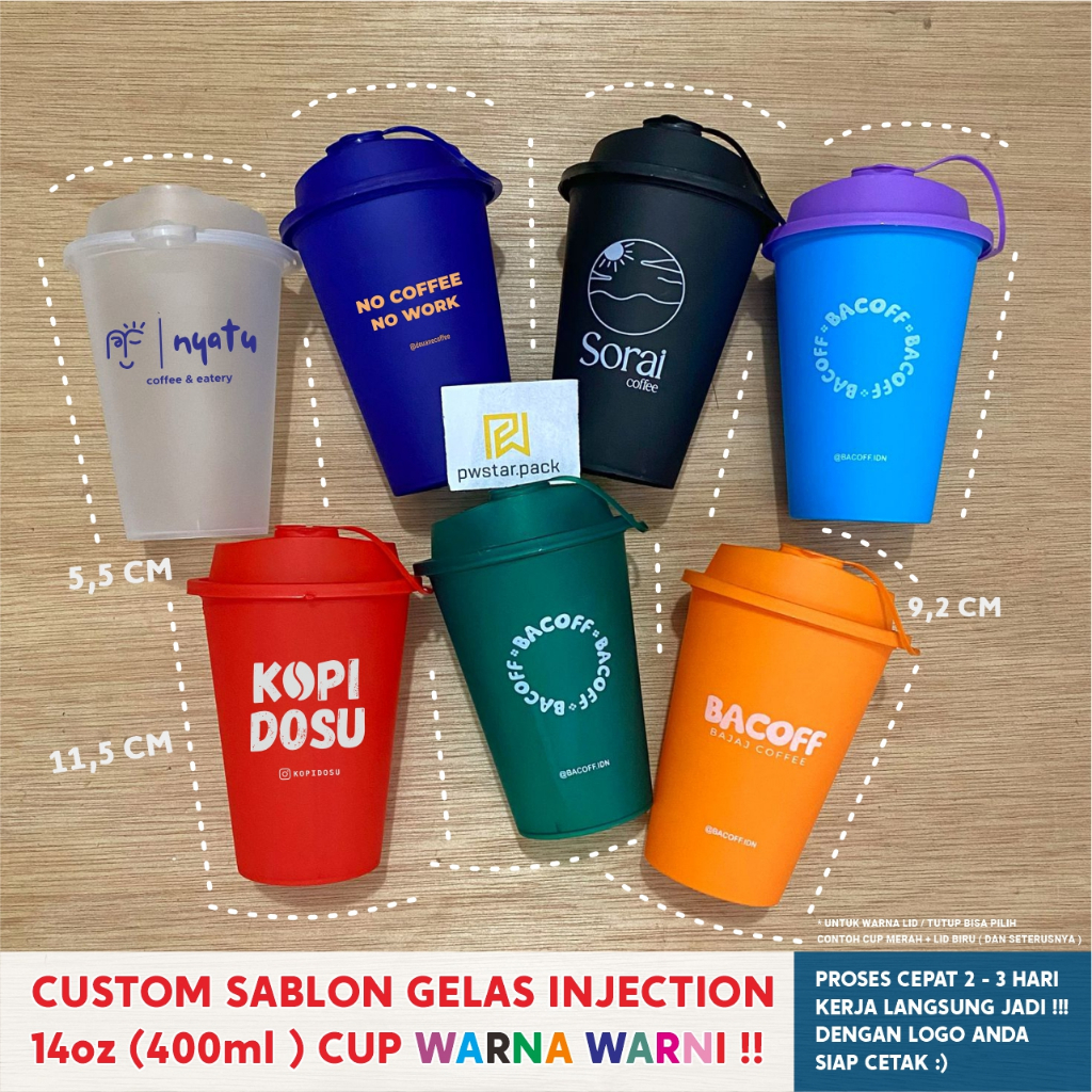 SABLON CUP INJECTION 14oz WARNA WARNI !! Harga Sudah Termasuk LID / Tutup & Cetak Satu Warna