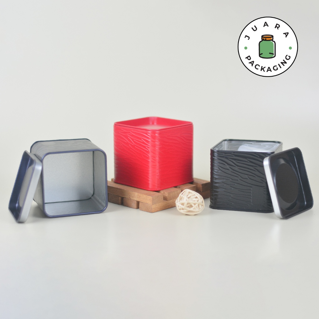 Jar Tin Can Kotak Motif Texture Warna Hitam Merah Biru + Plastik – Wadah Matcha Powder Ceremonial Grade Pure 100% Tempat Teh Kedap Udara Kontainer Serbaguna Wadah Kopi Bubuk Toples Bumbu Rempah Herbal Tepung Powder Isi Ulang Elegan