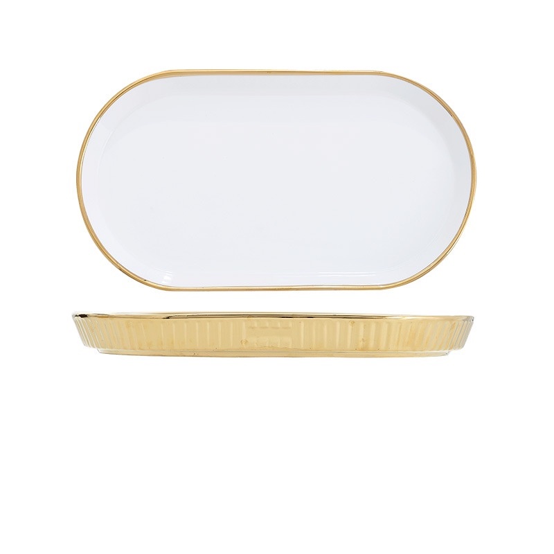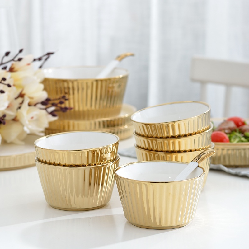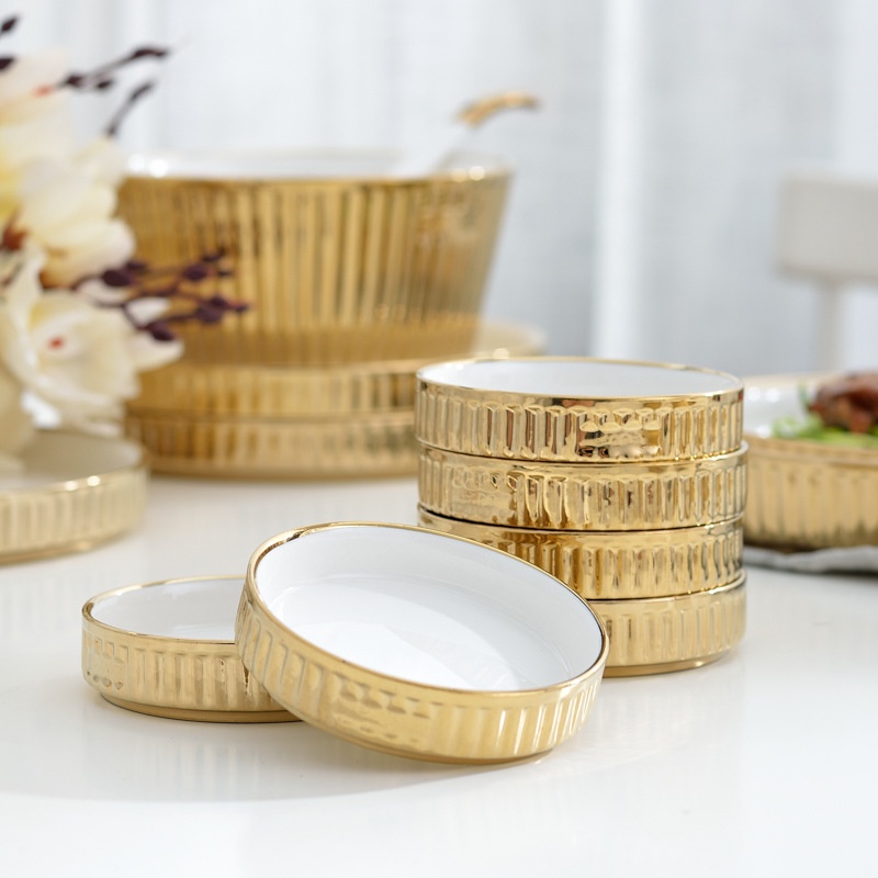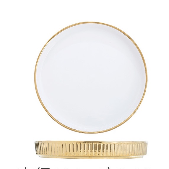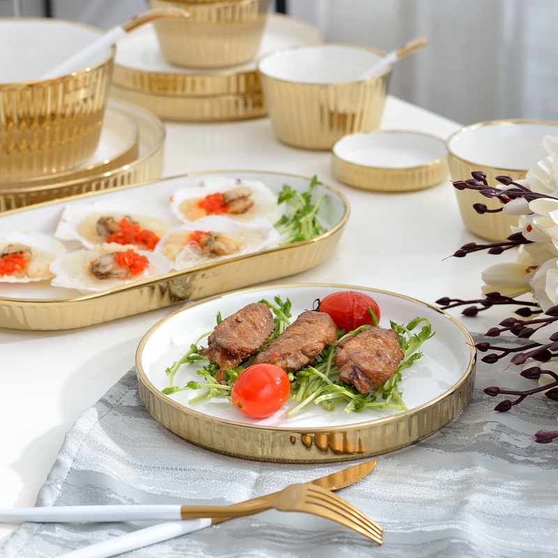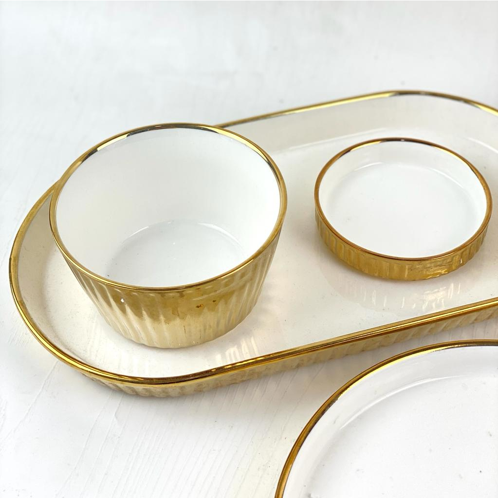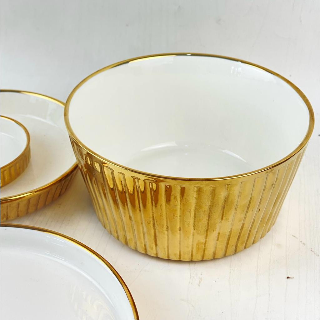 ASHOME Piring Keramik & Mangkuk Keramik Outer Gold Motif Garis / Ceramic Plates and Bowl Outer Gold White Elegant / Piring Keramik Putih Gold / Piring Makan Aestetik / Piring Makan Sultan / Piring Makan Mewah