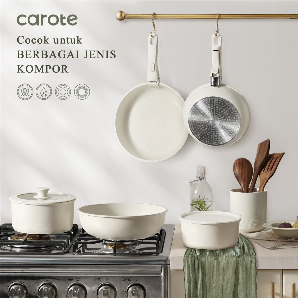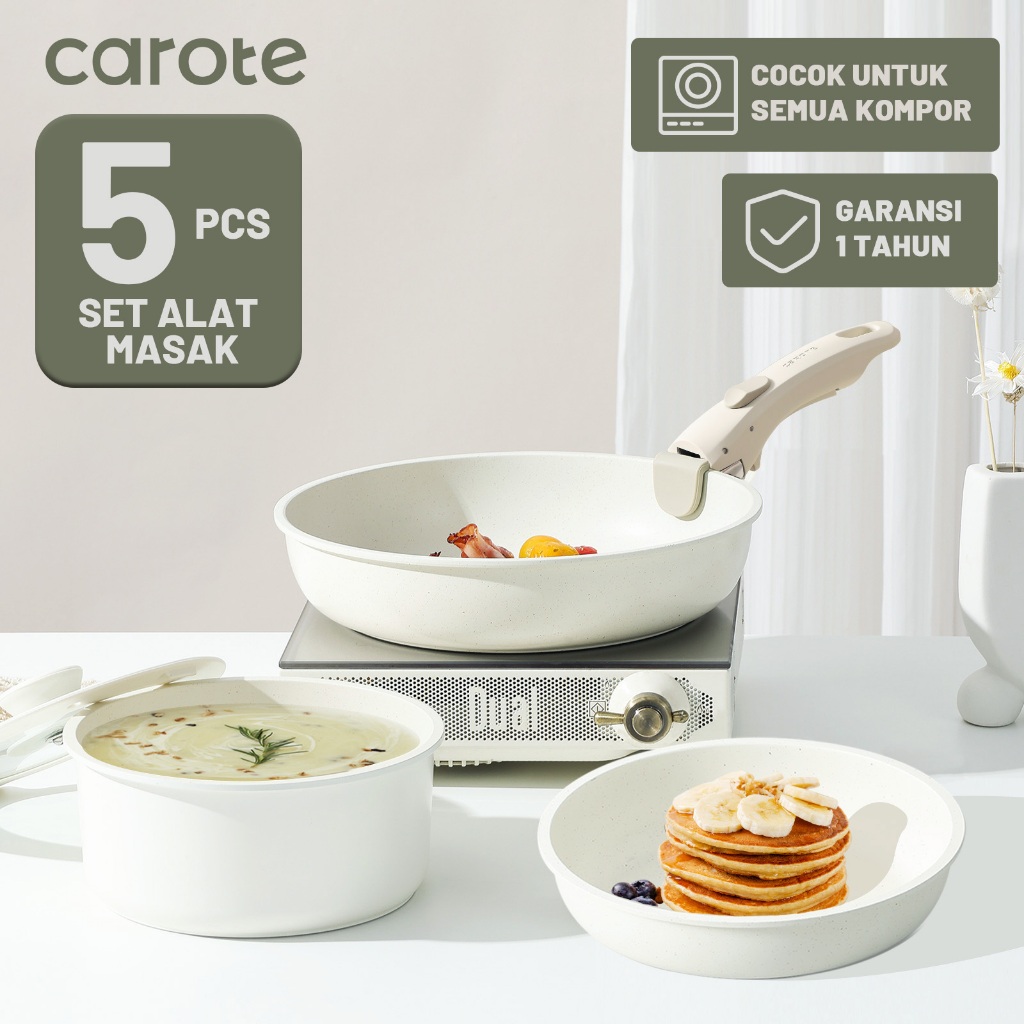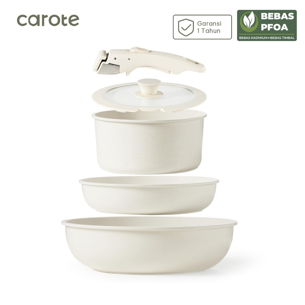 CAROTE Peralatan Masak Set 5 PCS Dengan Gagang Lepas Pasang Memudahkan Penyimpanan Lapisan Granit Cocok Untuk Semua Jenis Kompor Aman Untuk Oven Panci Susu Wajan Penggorengan Free PFOA Garansi 1 Tahun Ice Vanilla Putih