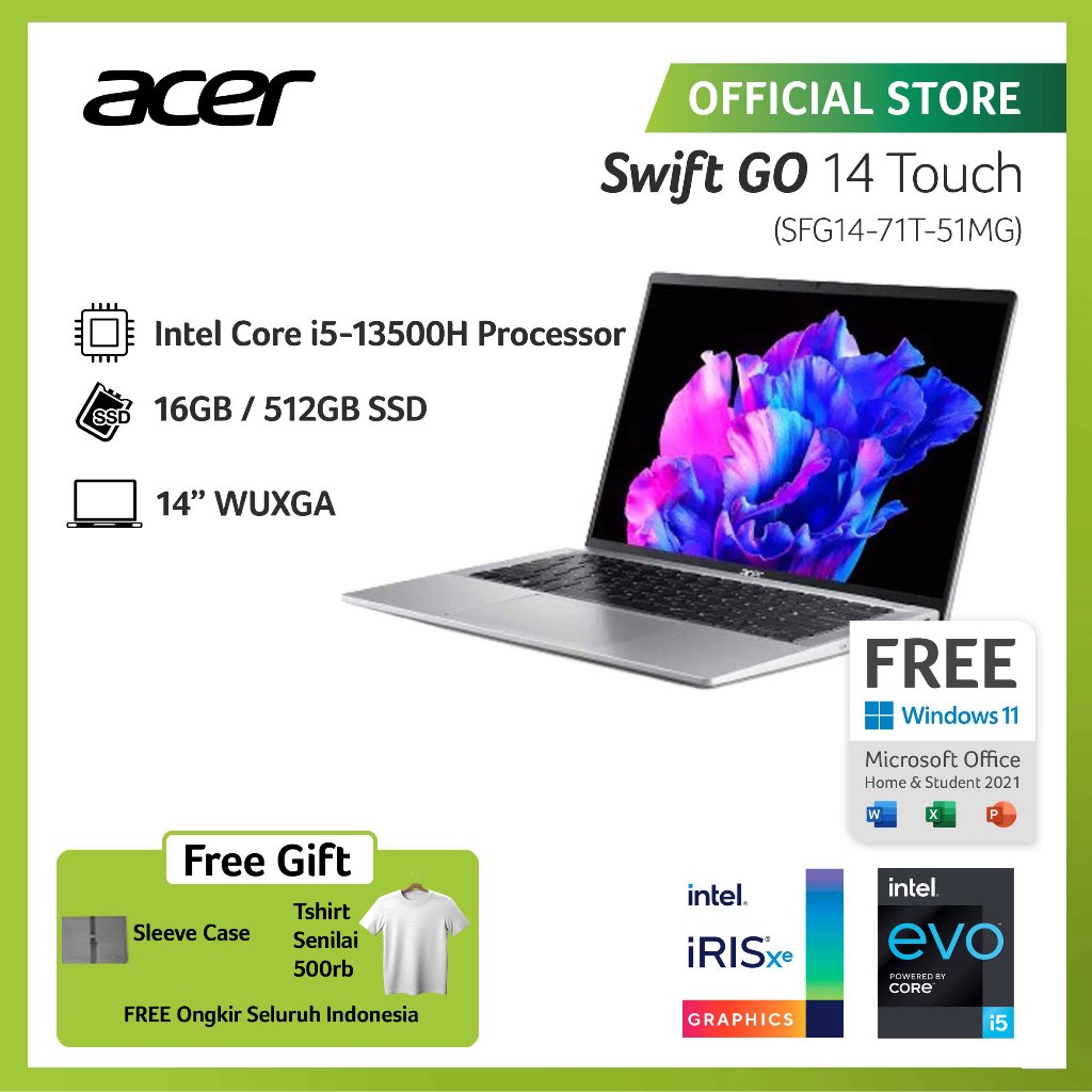 (FREE EXCLUSIVE TSHIRT ) ACER LAPTOP SWIFT GO 14 TOUCH SFG14-71T-51MG 14" WUXGA INTEL EVO I5-13500H RAM 16GB STORAGE 512GB SSD GRAPHICS INTEL IRIS XE WINDOWS 11