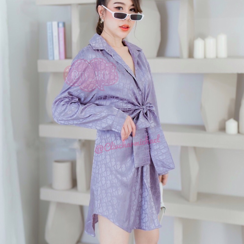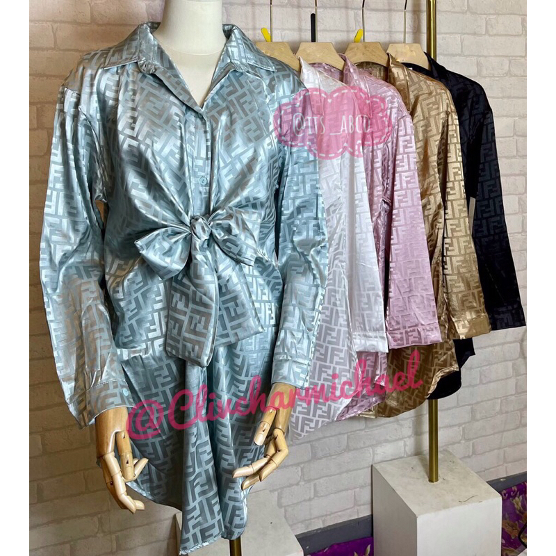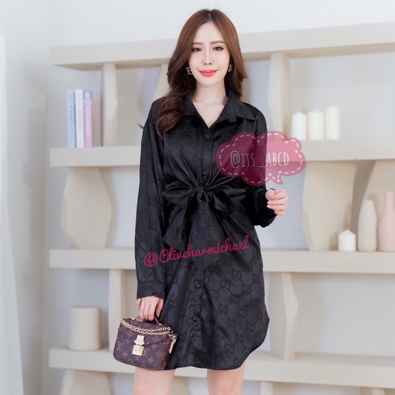 tunik kemeja dress kemeja panjang ikat perut pita twist mewah silk satin logo branded big size