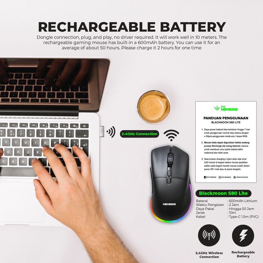 Mouse NYK S80 Lite Wireless Gaming Mouse Nemesis Blackmoon