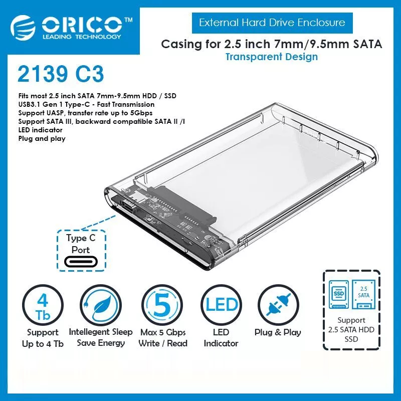 ORICO 2139C3 2.5 inch Type-C Transparent Hard Drive Enclosure