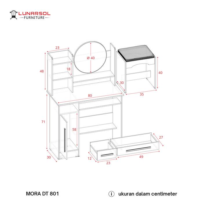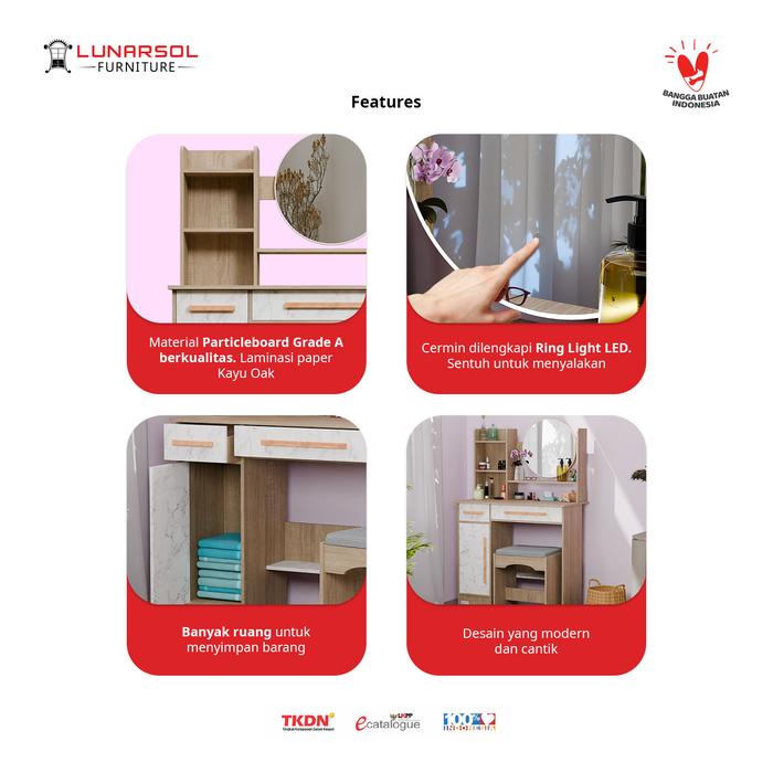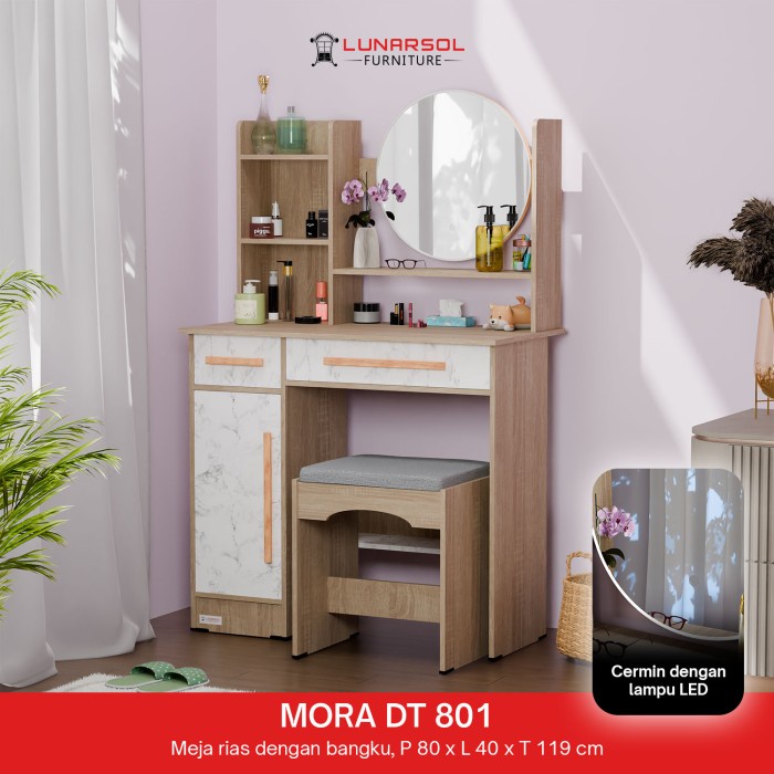 PREMIUM Meja Rias LUNARSOL Furniture MORA DT-801 dengan Cermin LED dan Kursi Kayu - Rak, Laci Vanity
