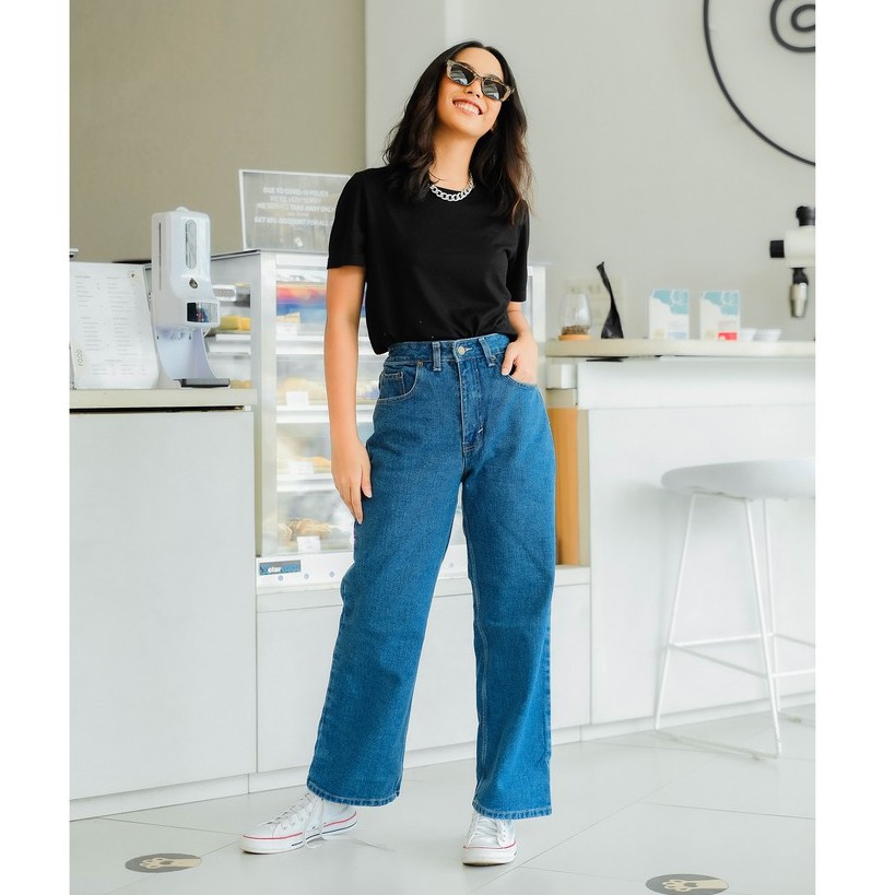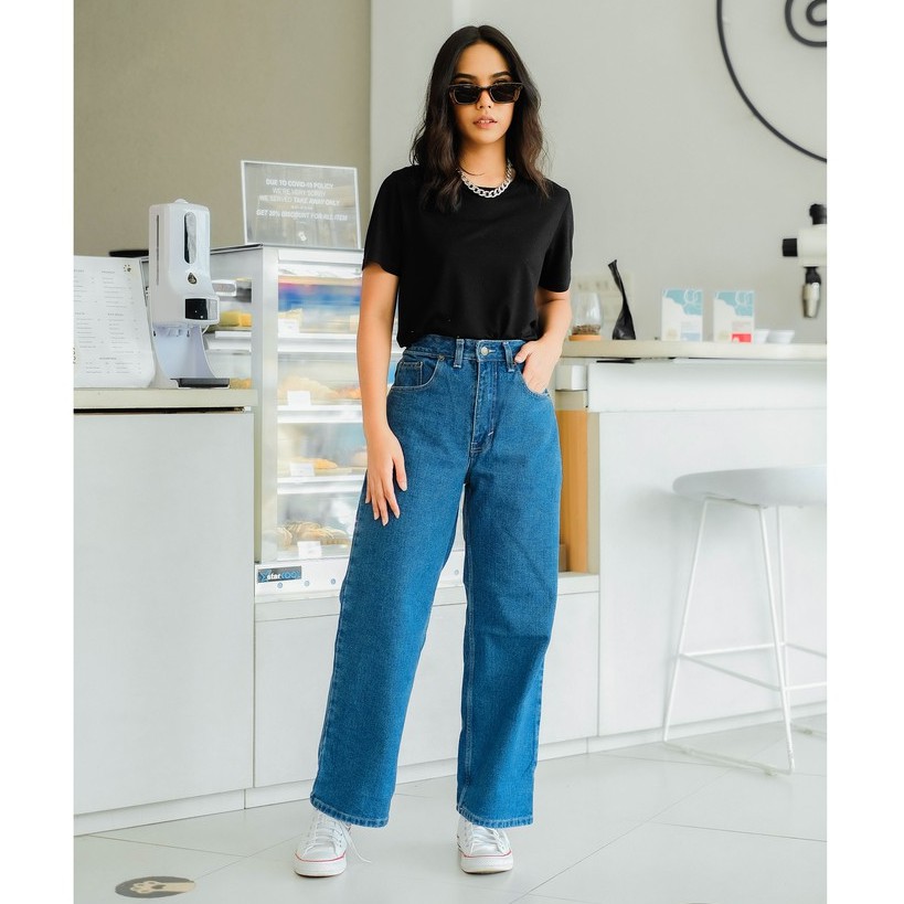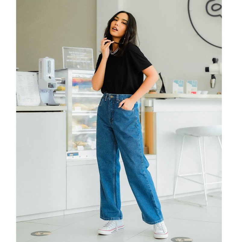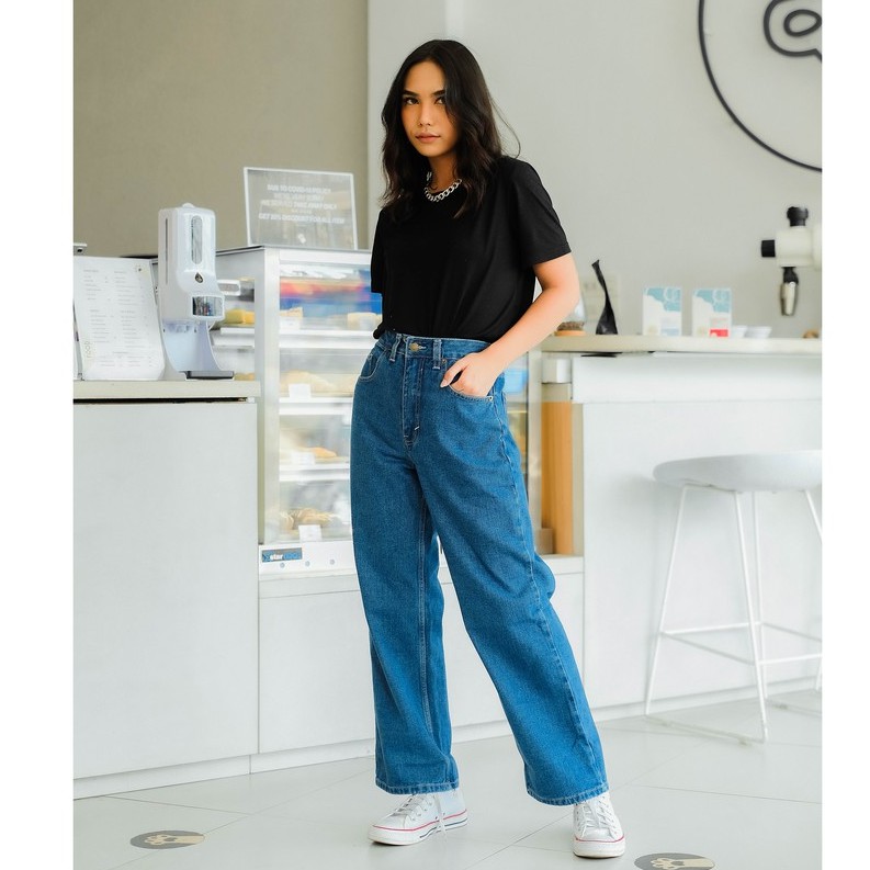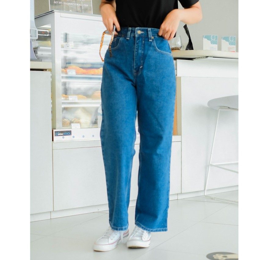 RAINBOO - Celana Baggy Loose Jeans High Waist Wanita - Navy