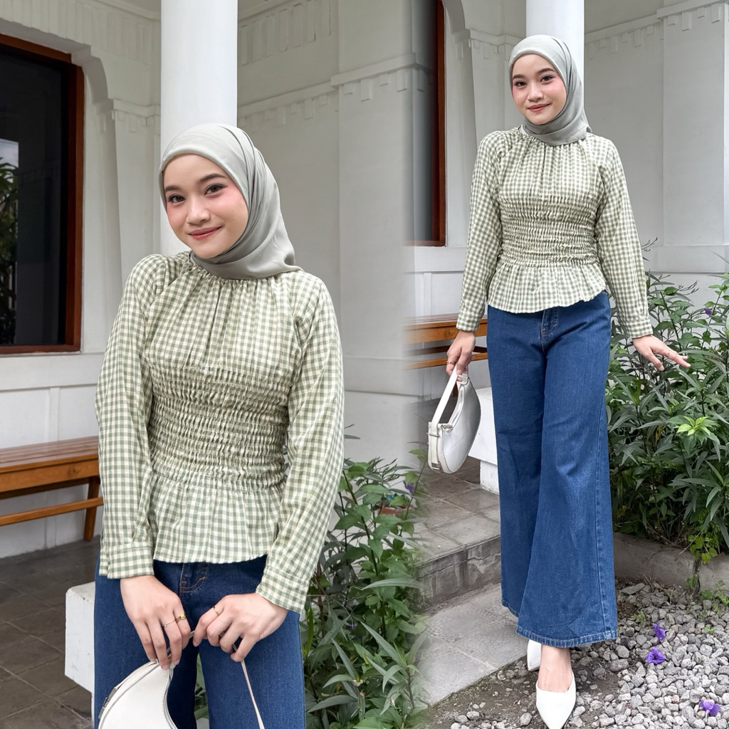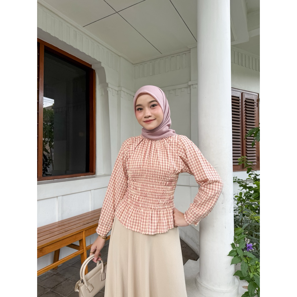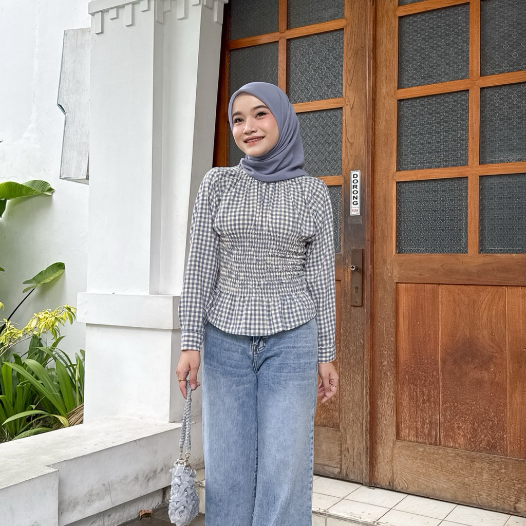 Rere Atasan Wanita Blouse Kerut Motif Kotak Casual Top