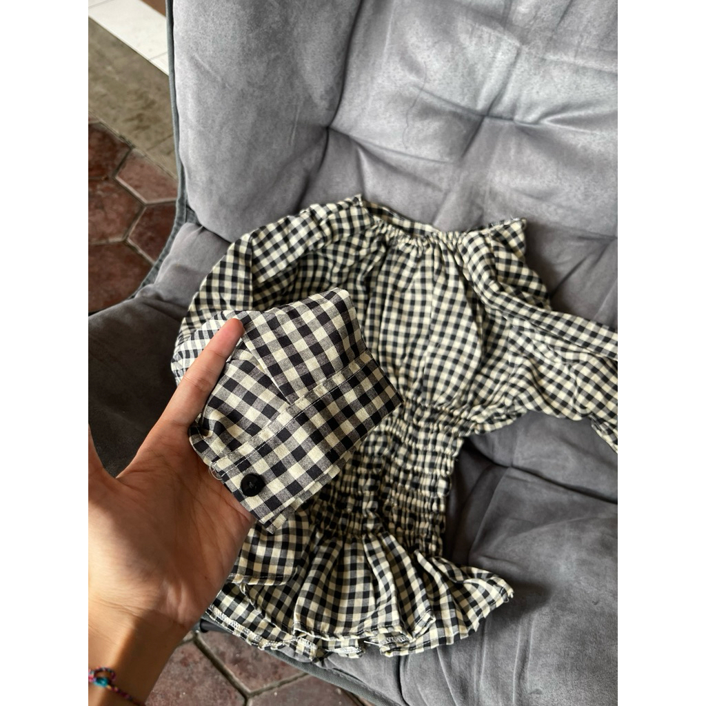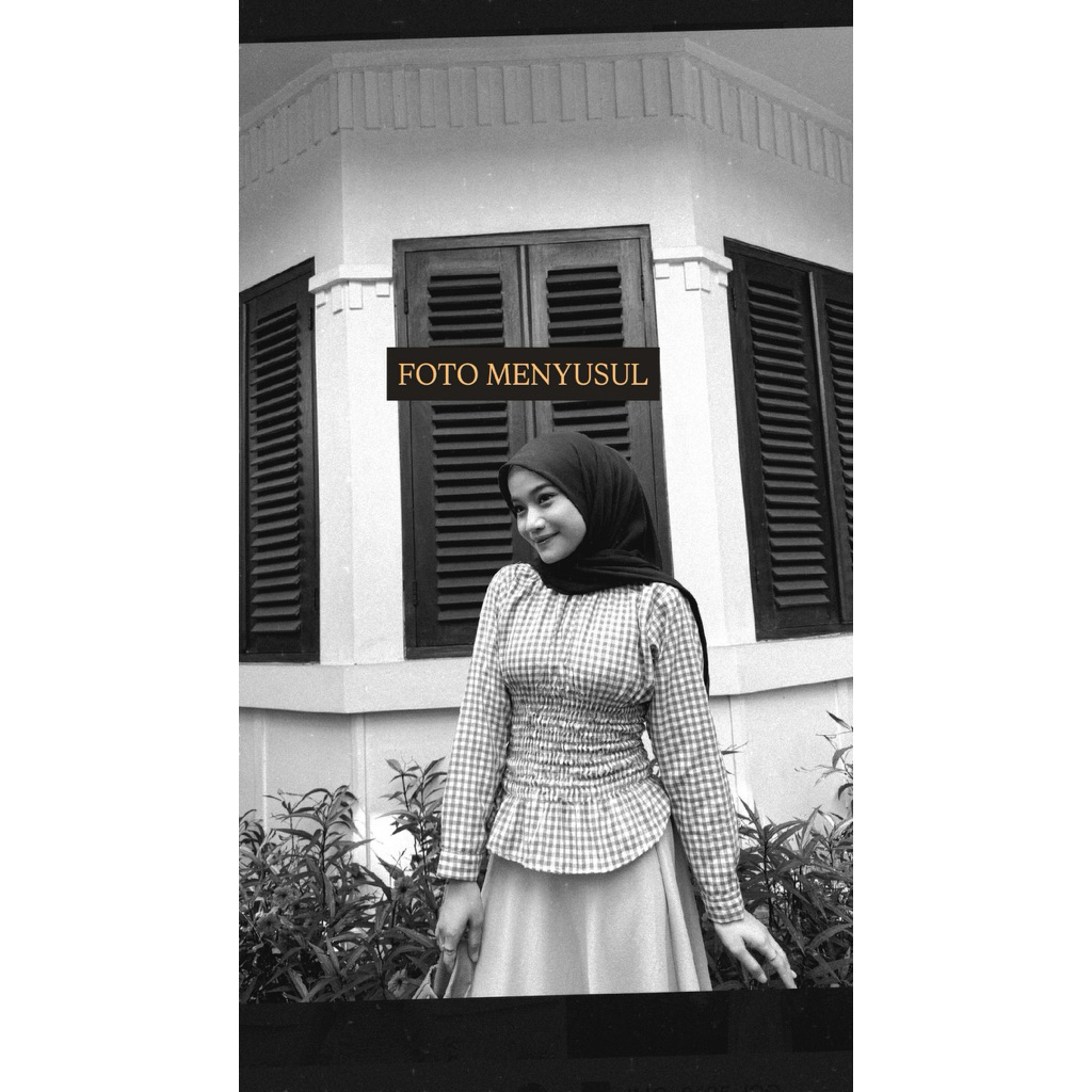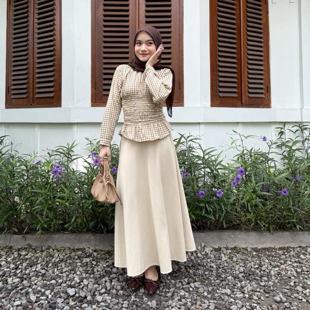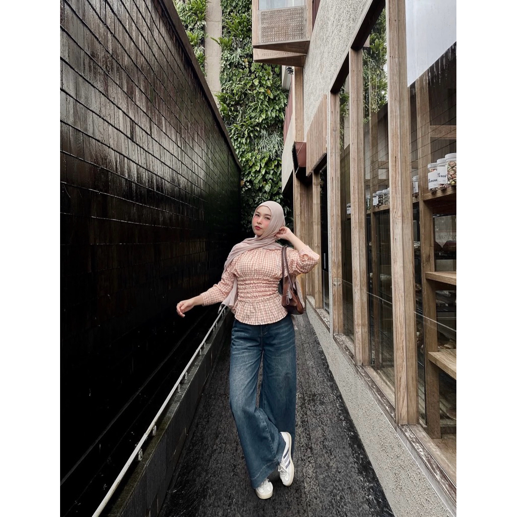Rere Atasan Wanita Blouse Kerut Motif Kotak Casual Top