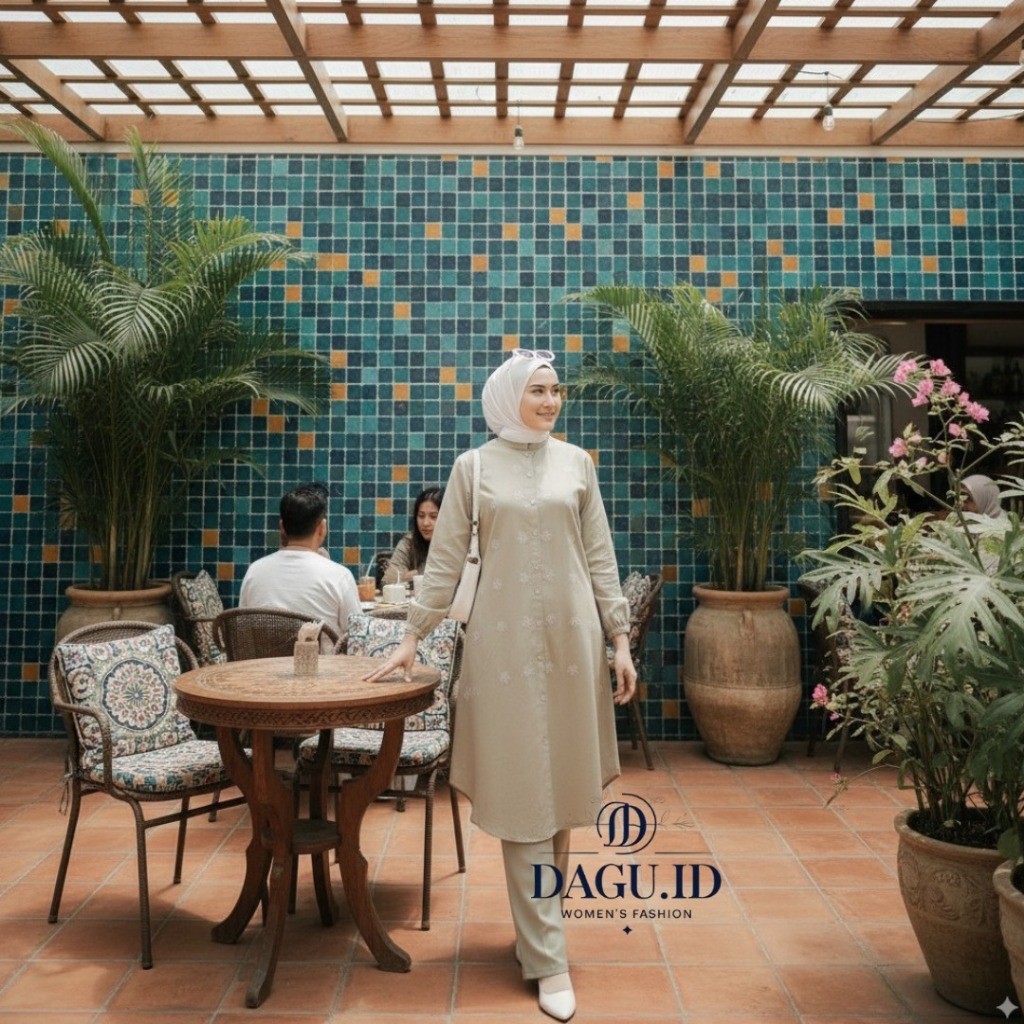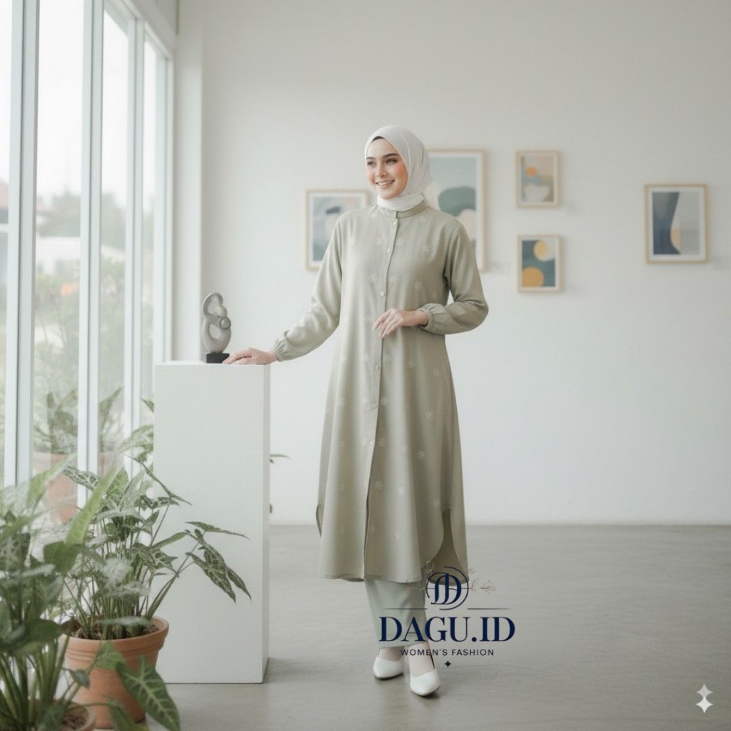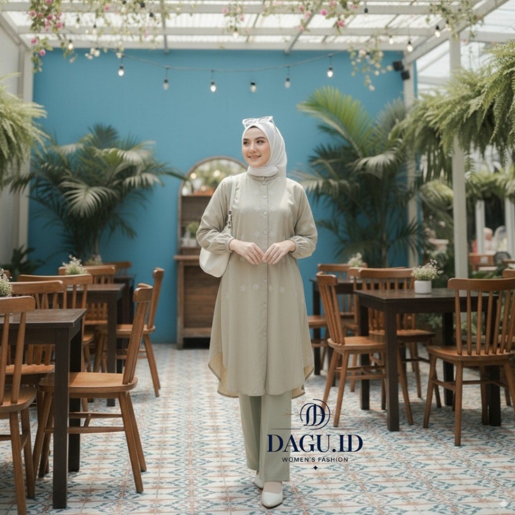 BIGMAXS Dagu - Baju Setelan Wanita Muslimah Jumbo Tunik Kancing Depan & Celana Bordir Modern
