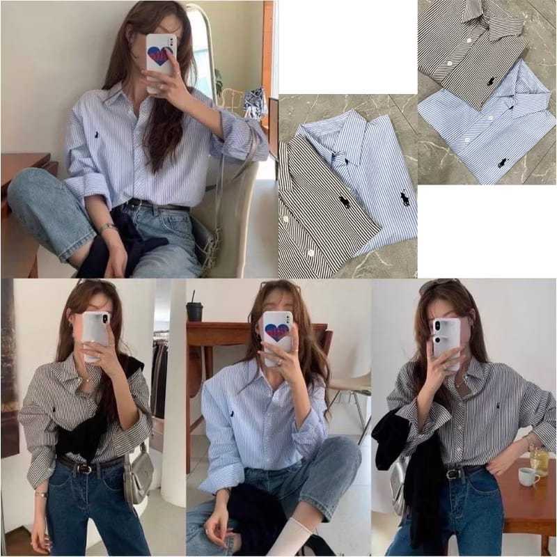 atasan kemeja polo shirt wanita / kemeja kuda / atasan kemeja salur wanita kemeja kekinian LD 110