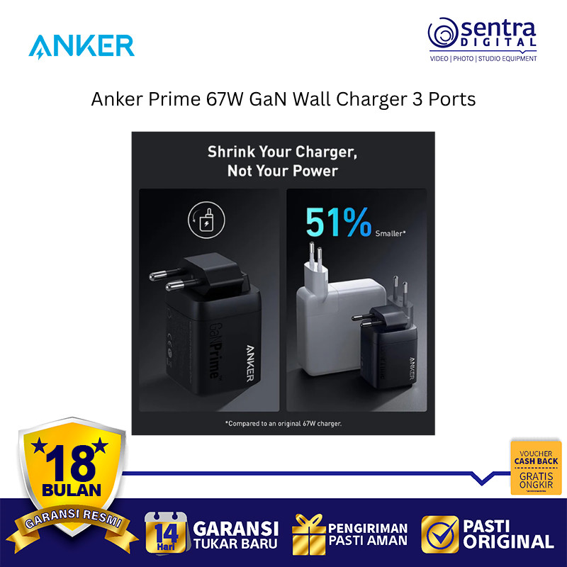 Anker Prime A2669313 Charger Wall 67W GaN 3 Port Fast Charging USB-C PPS iPhone MacBook