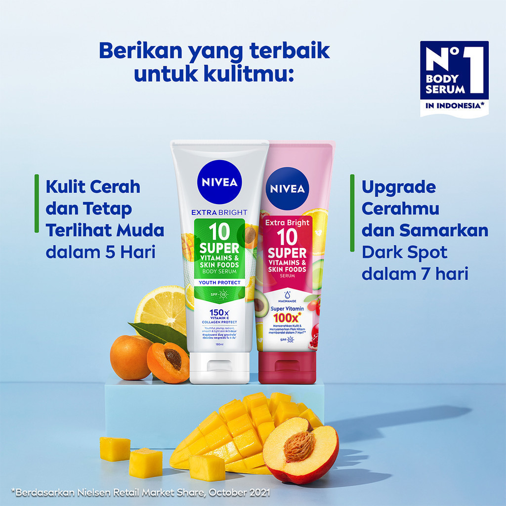 (PAKET HEMAT ISI 3) NIVEA Body Serum Extra Bright 10 Super Vitamins SPF15 180ml - Hand body serum moisturizer menyamarkan noda flek hitam dark spot mencerahkan kulit kusam badan glowing brightening tone up lembap - 10x Vitamin C, Niacinamide, Pomegranate