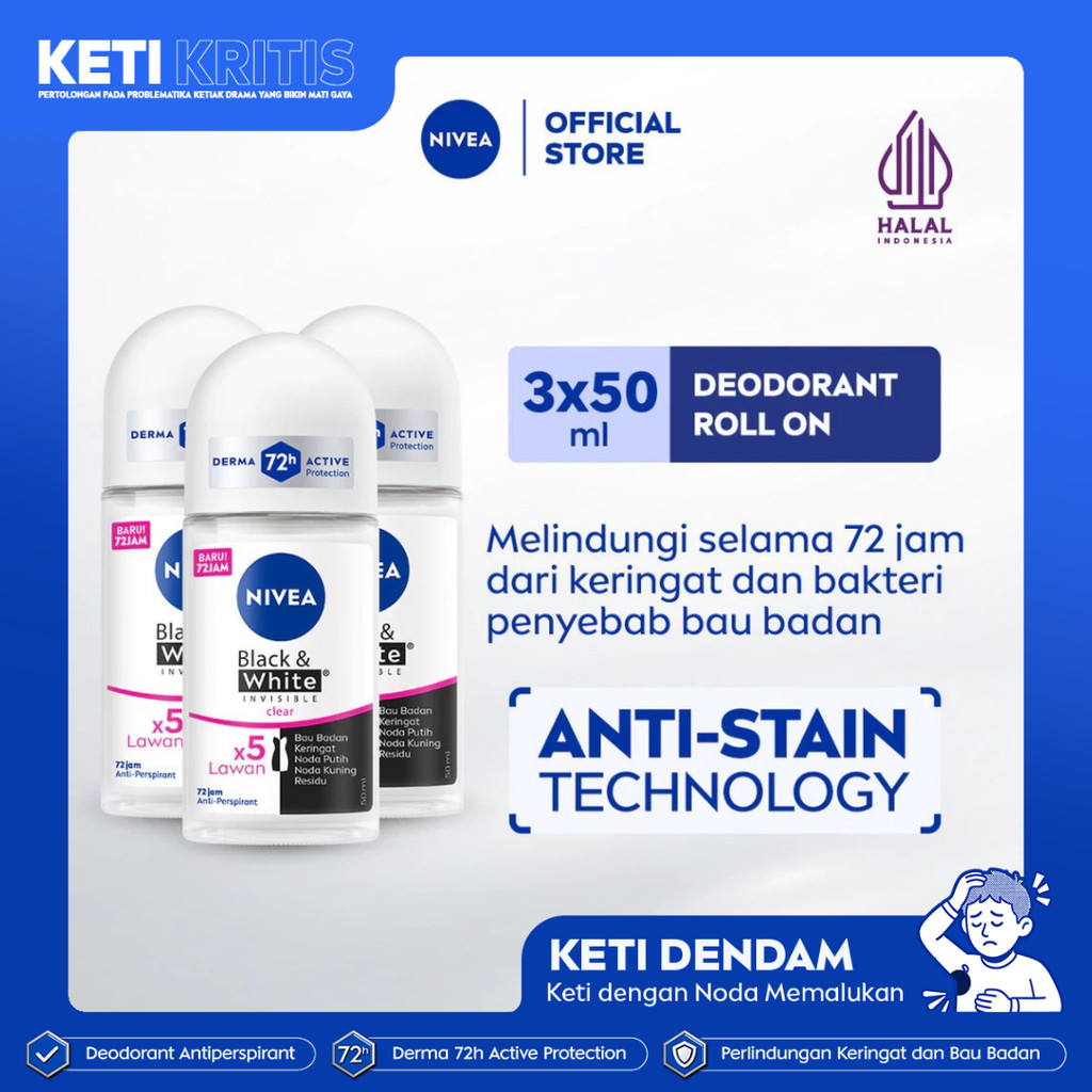 (PAKET HEMAT ISI 3) NIVEA Deodorant Roll On Black & White Invisible Original 50ml - Deodoran wanita melawan bau badan tahan keringat anti noda residu dengan wangi tahan lama seharian - Antiperspiran, tidak mengandung ethyl alkohol cocok semua jenis kulit