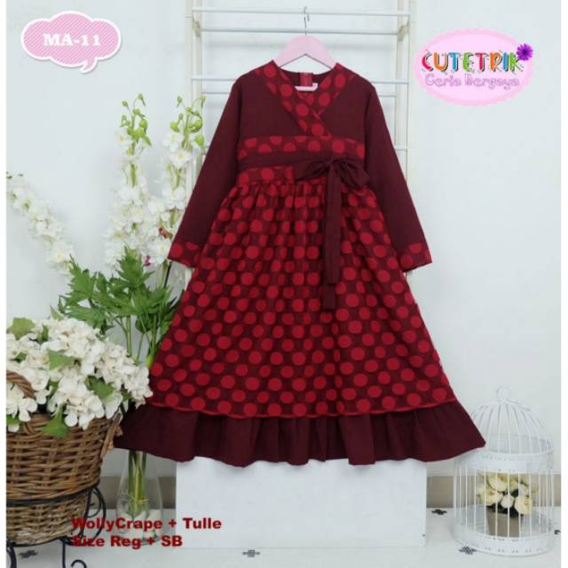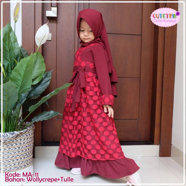 (3-12 tahun) MA 11 Baju Muslim Setelan Gamis Anak Cutetrik Maroon Polkadot Tulle Dress