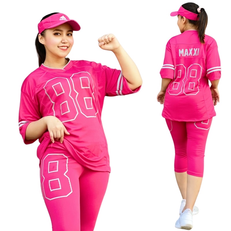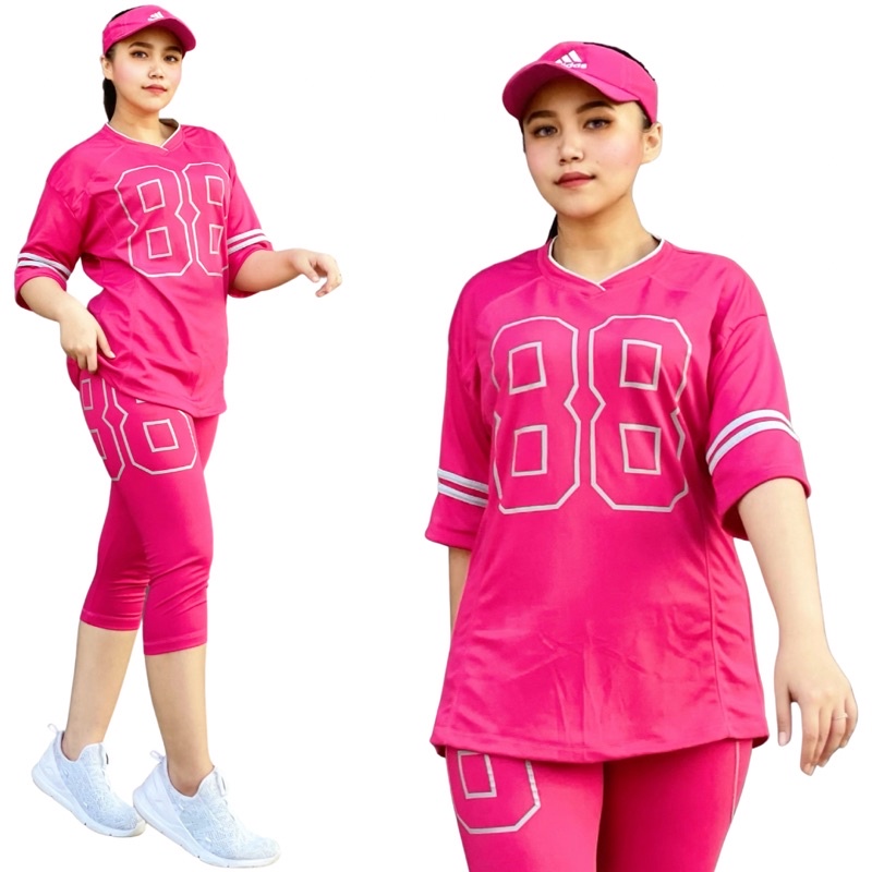 Set Baju 88 Pink List Abu Setelan Baju Senam Gym Fitness Gowes Cycling Running Jogging Training Lapangan Indoor Pendek Wanita