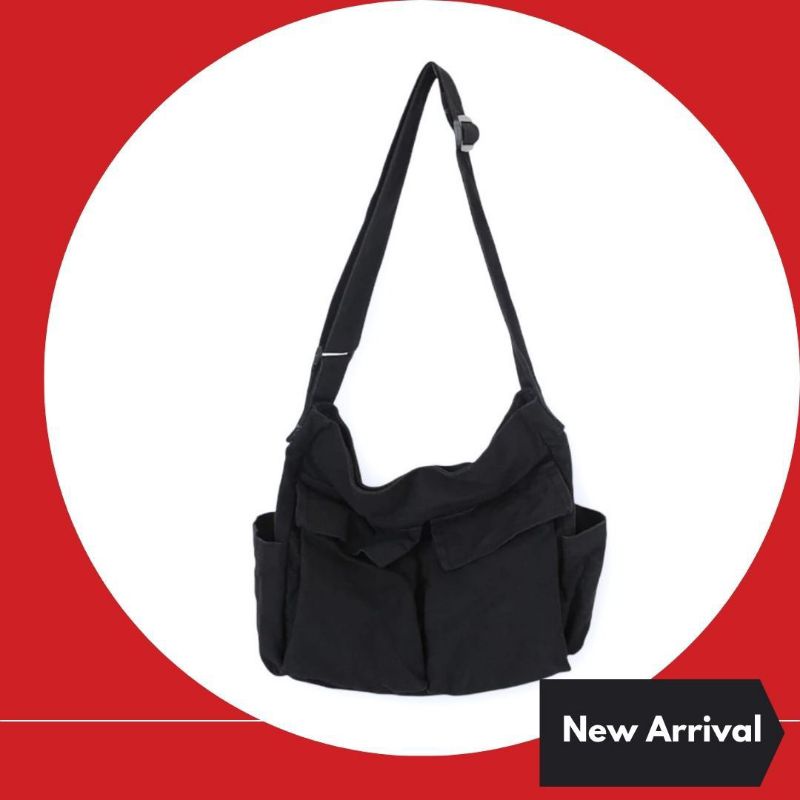 LPSB Extra Large Size Canvas Sling Bag With Pocket (Tas Selempang Kanvas Besar) Casual Pria Wanita Bahu Shoulder Big Tote Totebag Saku Kancing Resleting Korean Style Kado Hadiah Cewek Cowok Unisex Japan Lokal Messenger Crossbody