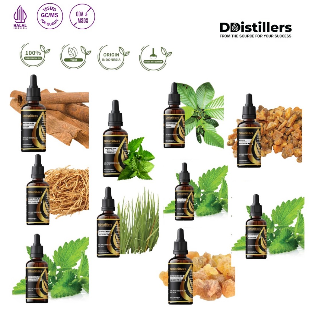 [50-100ML] DDISTILLERS Essential Oil Kemenyan, Nilam, Akar Wangi, Gurjun, Massoia Murni 100%Aromatherapy Earthy Aroma Bumi