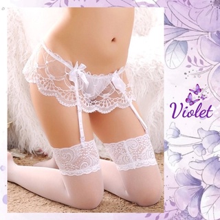 Violet Stocking Seksi Set + G-String Celana Dalam Wanita Renda With Garter Belt Erotis 1088