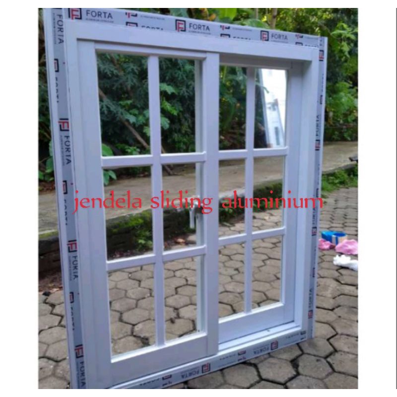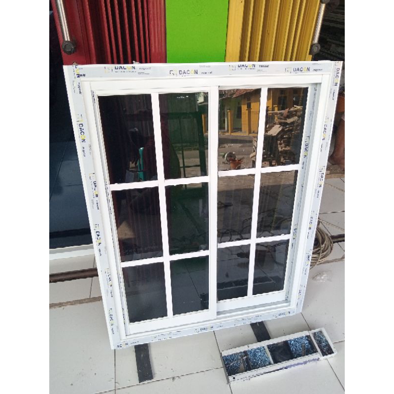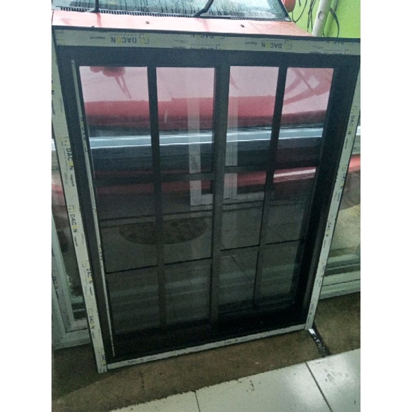 Jendela sliding aluminium kaca ornamen 100x100 free paking kayu