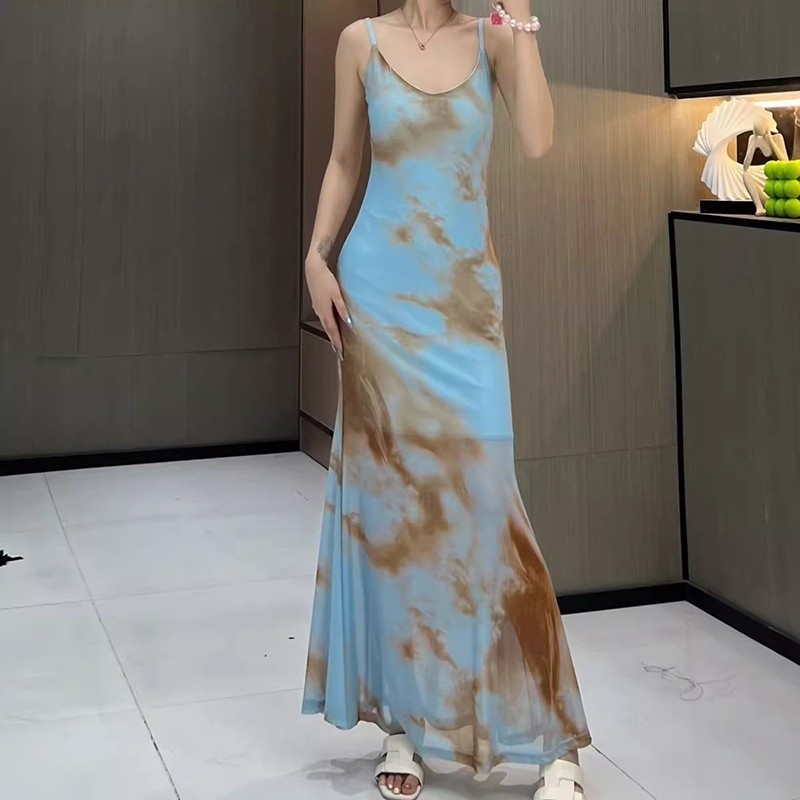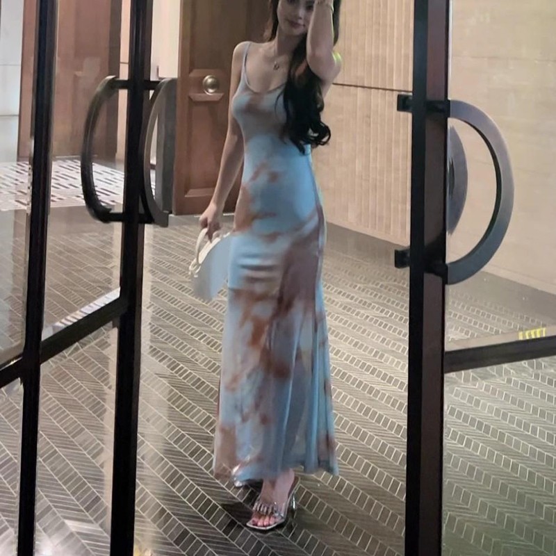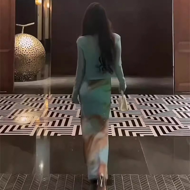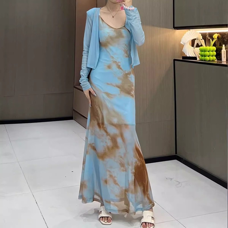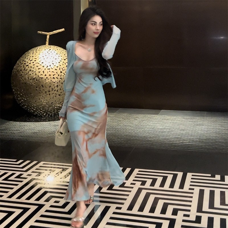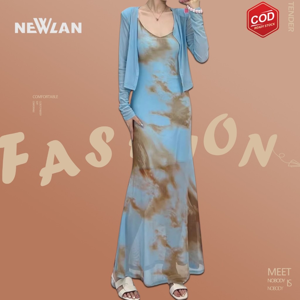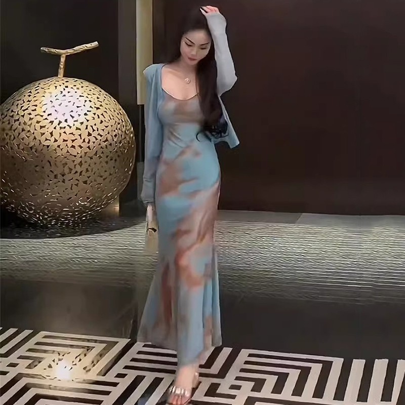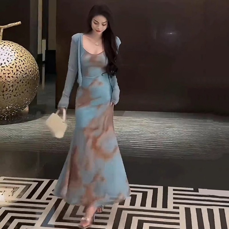Newlan QZ197 Wanita Lengan Panjang Knit Setelan Casual Basic Gaun Bunga Korea Baru Rok Pinggul Biru Pakaian Pantai Wanita Gaun Putri Korea Gaun Kardigan Panas Gaun Panjang Ramping Gaun Pesta Dress Long Sleeved French Style Long Dress Floral Gaun Dan Cardi